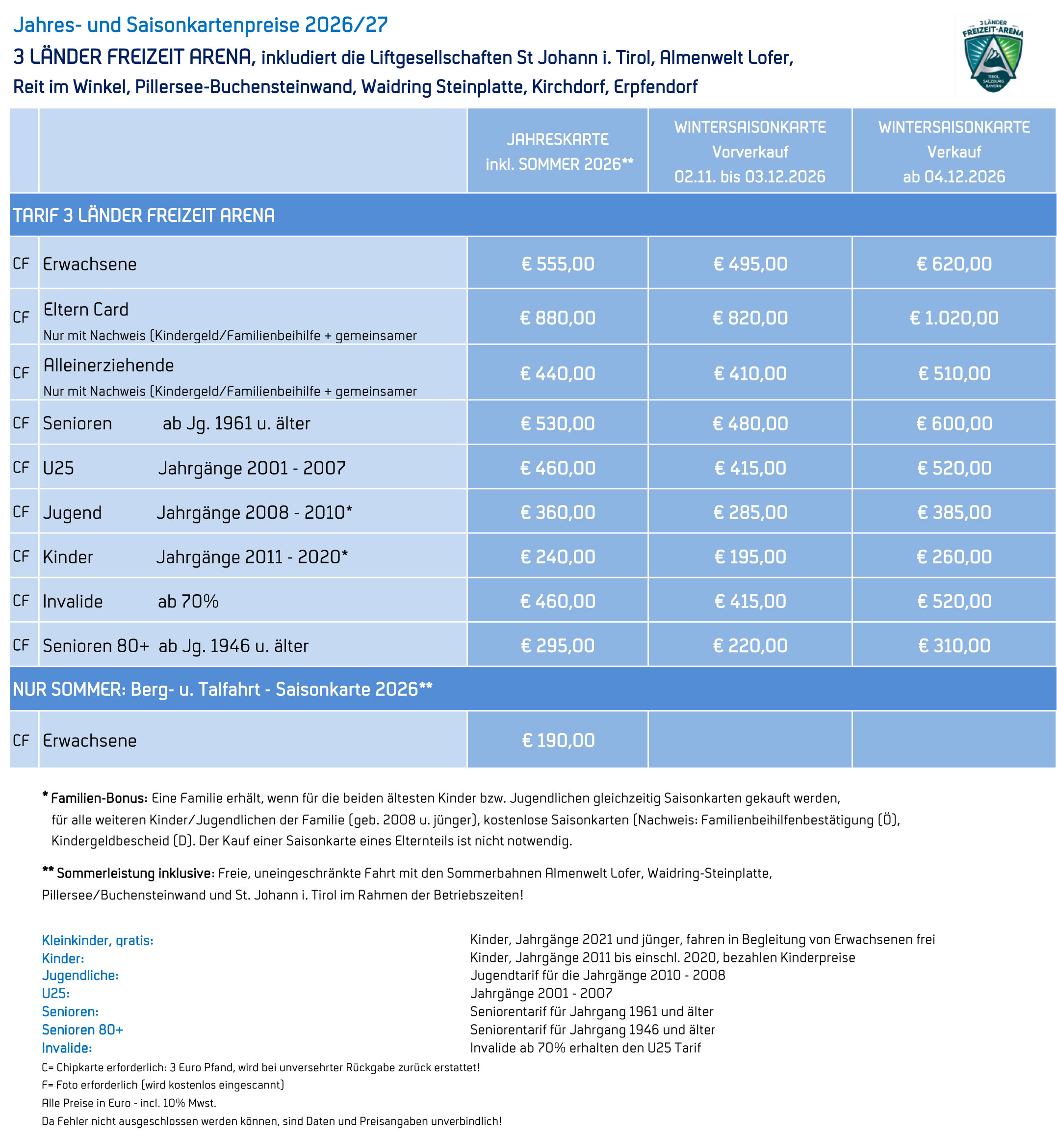 3 Länder Freizeit-Arena Preise Jahres- u. Saisonkarten 2026-27