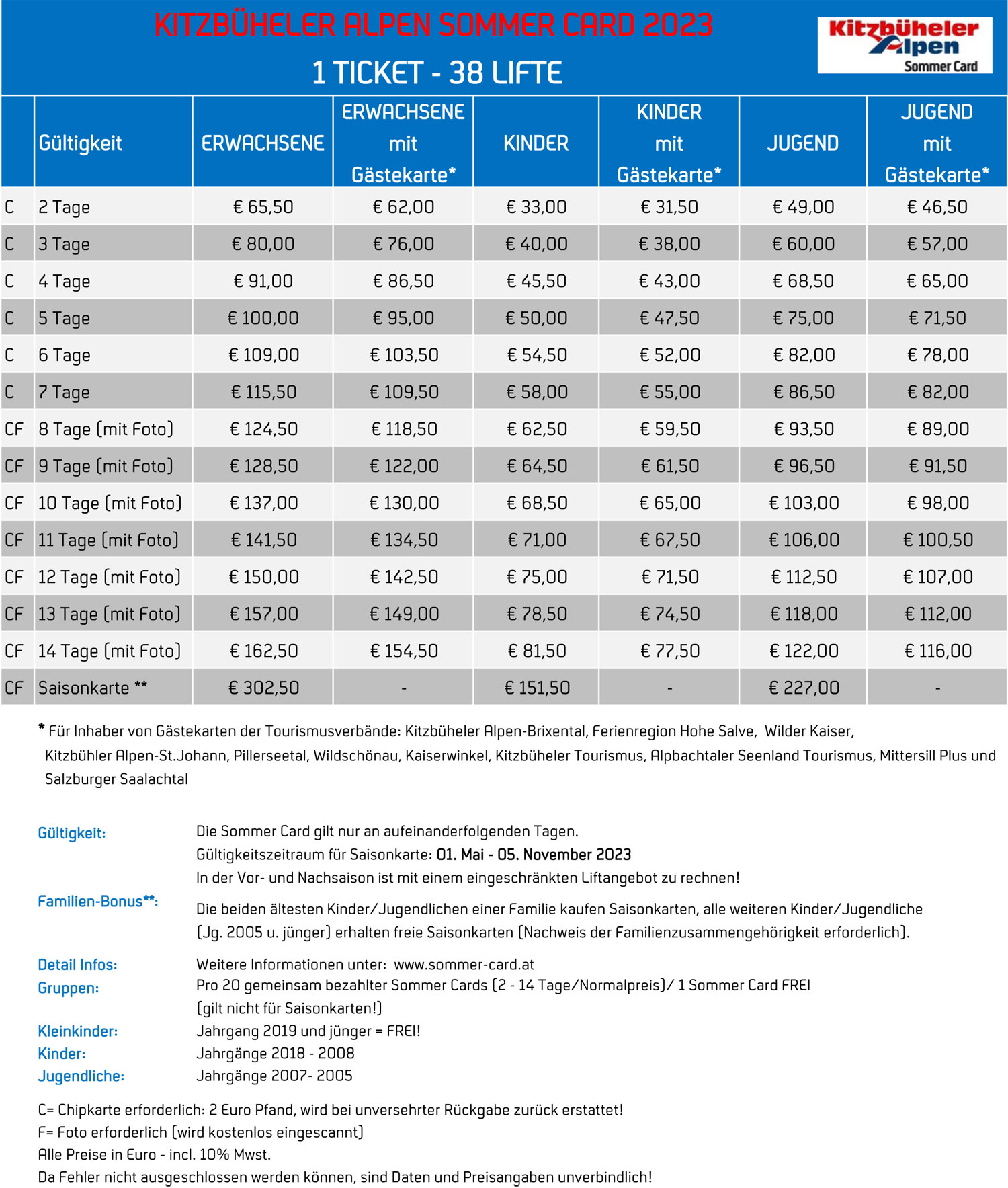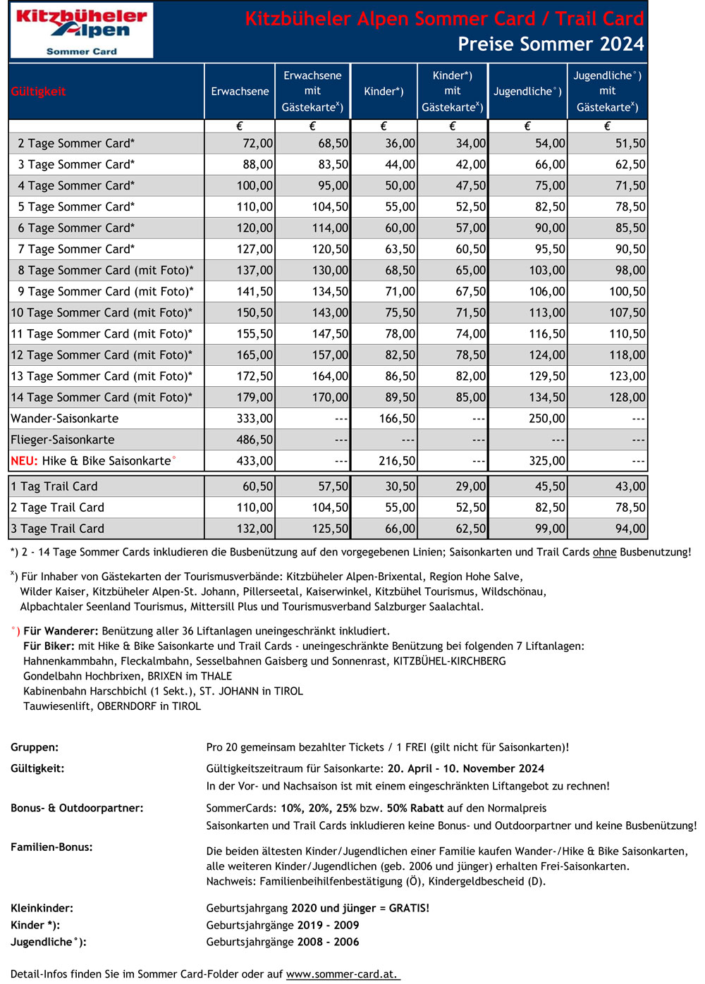 Tarife Kitzbüheler Alpen Sommer Card 2025