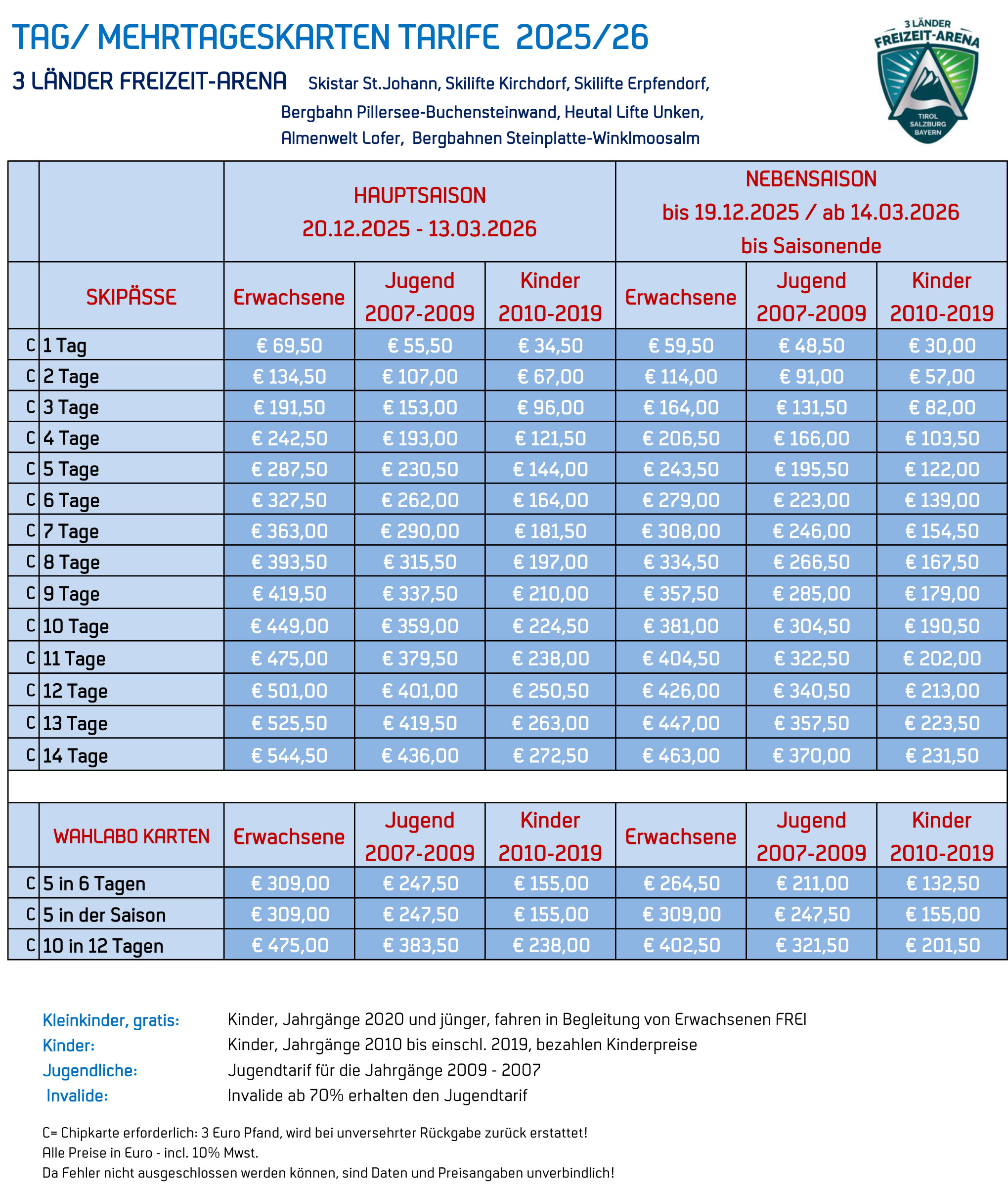 Für alle, die zusätzlich zur Almenwelt Lofer auch in andere Skigebiete fahren wollen, ist der 3 Länder Freizeit-Arena Skipass die optimale Lösung. Mit einem Skipass, stehen gesamt 8 Skigebiete zur Auswahl: Die Almenwelt Lofer ist in die 3 Länder Freizeit-Arena mit den Skigebieten Steinplatte, Winklmoosalm, St.Johann, Buchensteinwand, Kirchdorf, Erpfendorf und Unken/Heutal, eingebunden. Weitere Infos zu den einzelnen Skigebieten finden Sie auf der Website der 3 Länder Freizeit-Arena.