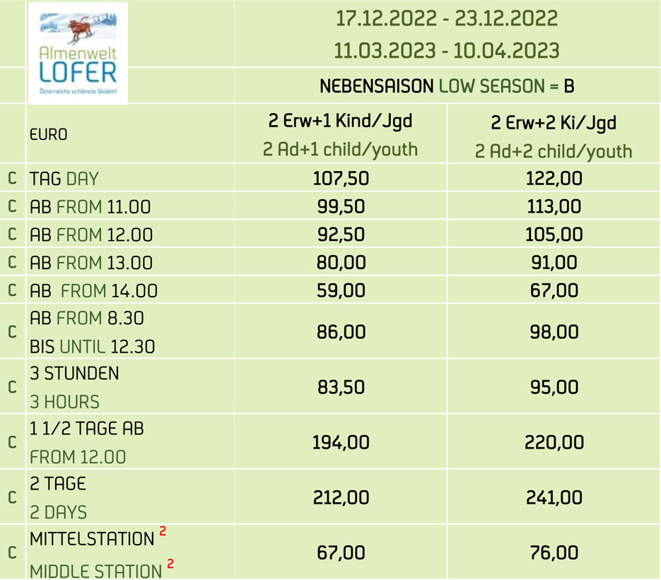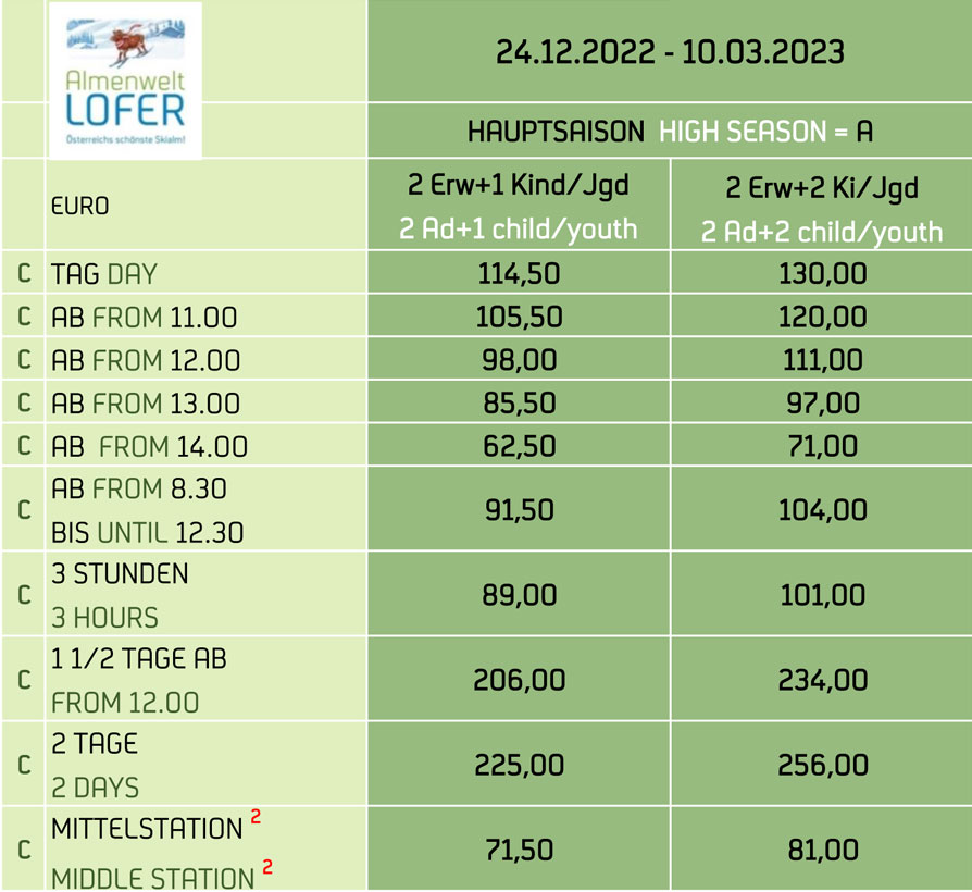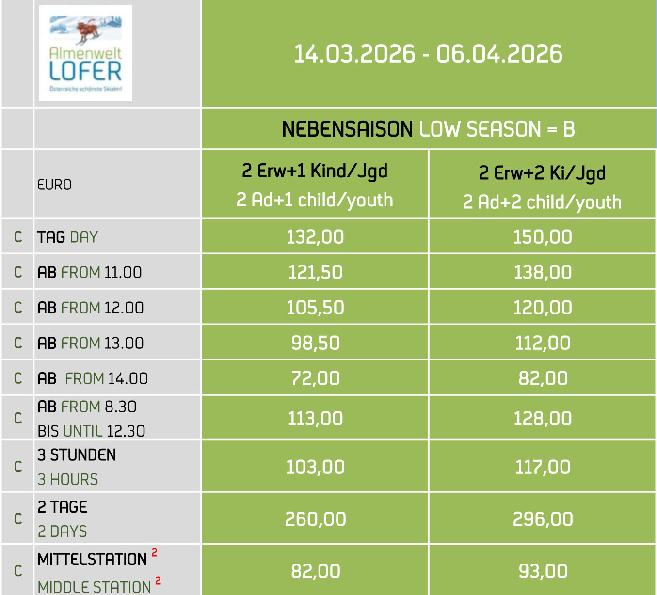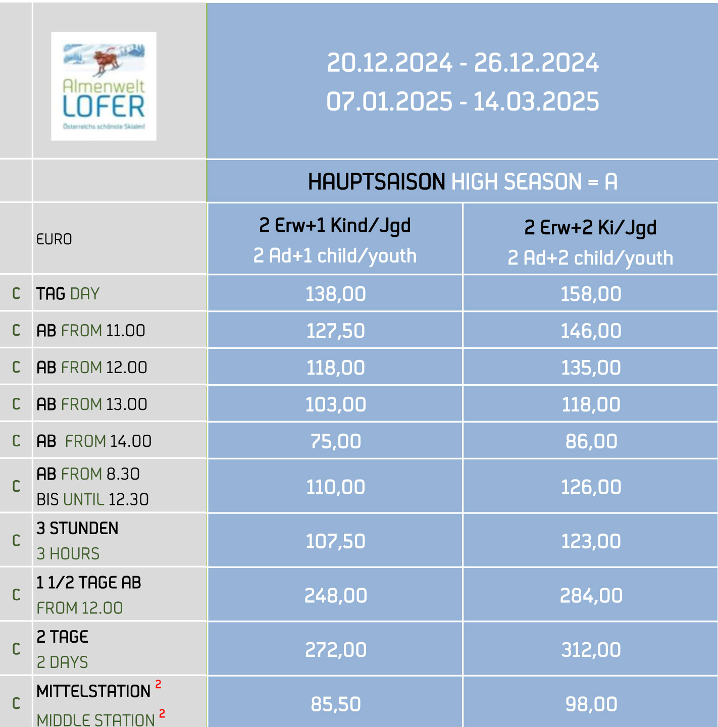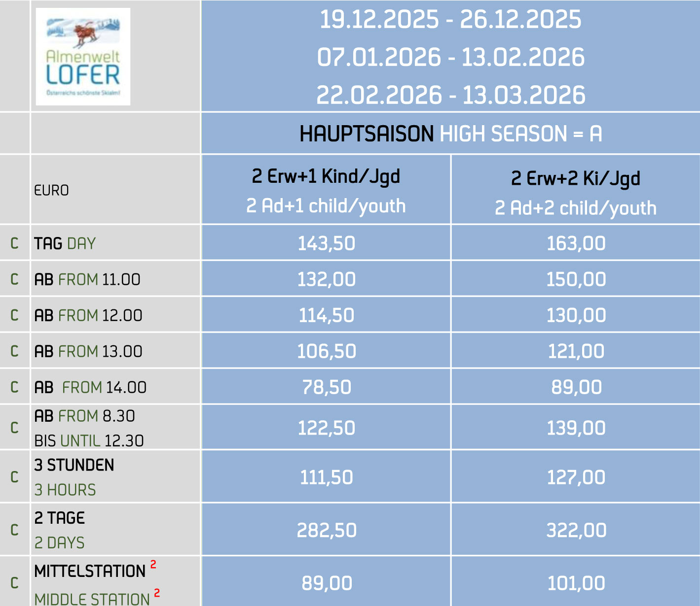 2 Familienpreise: Familienskipässe erhält man ab 2 Erwachsenen + 1 od. 2 Kinder/Jugendlichen (Jg. 2019 - 2007). Das 3. und weitere eigene Kinder od. Jugendliche fahren FREI, gilt NUR mit Nachweis der Familienzusammengehörigkeit (Nachweis gemeinsamer Wohnsitz erforderlich. Ein aktueller Meldezettel und ein Ausweis mit Bild sind vorzulegen.)
