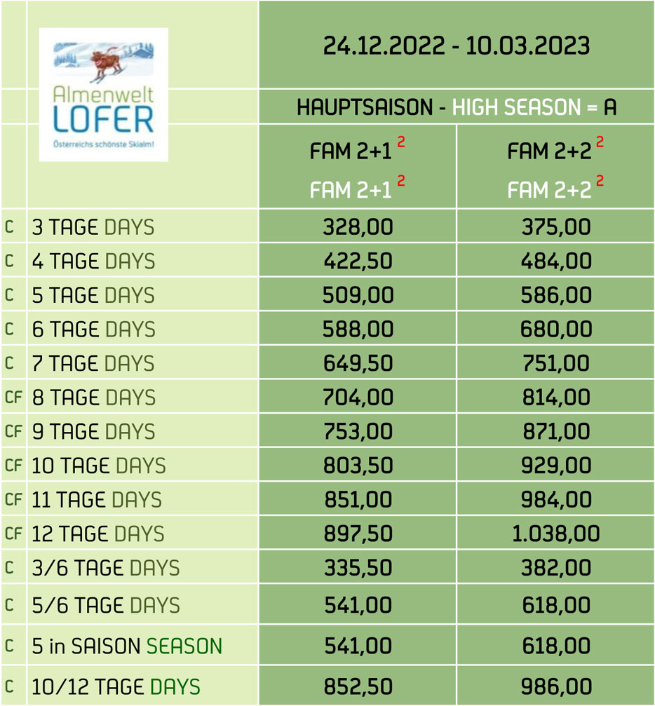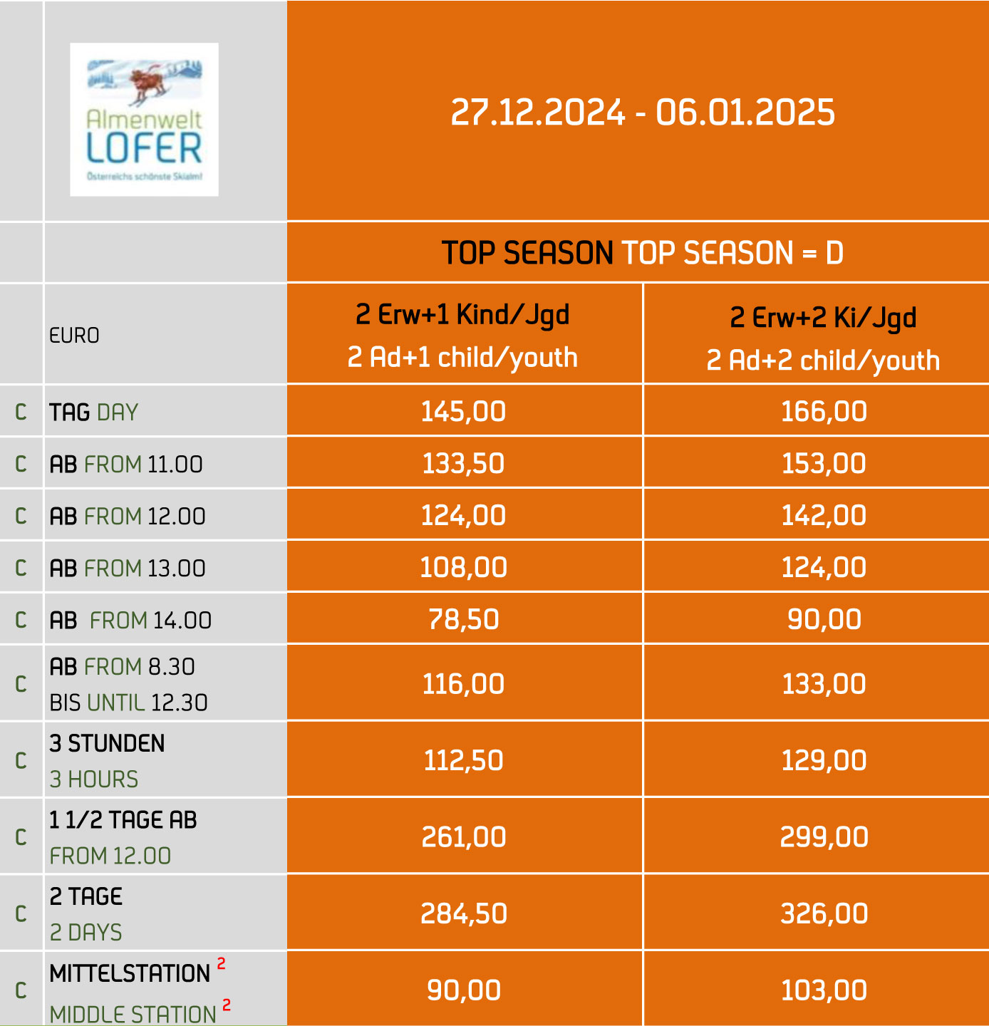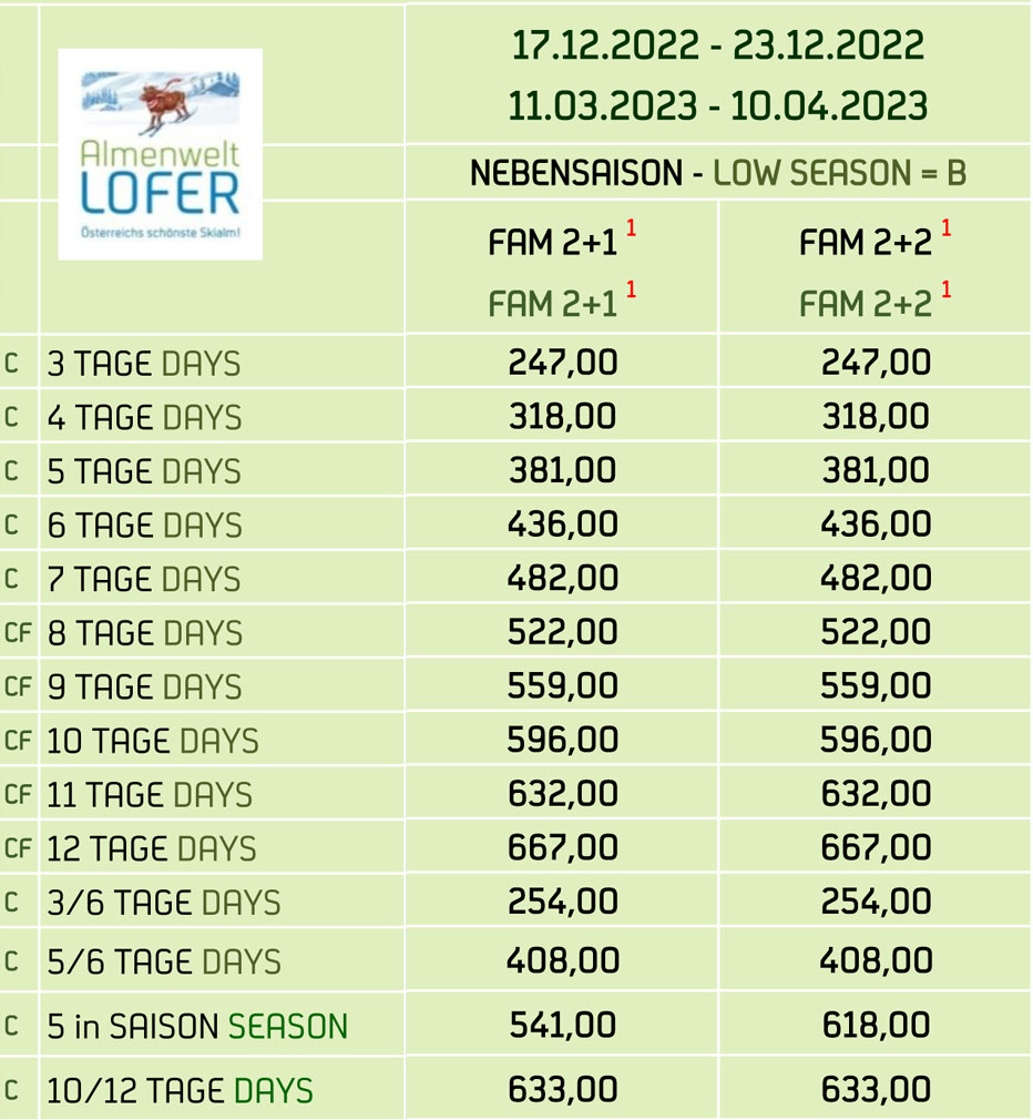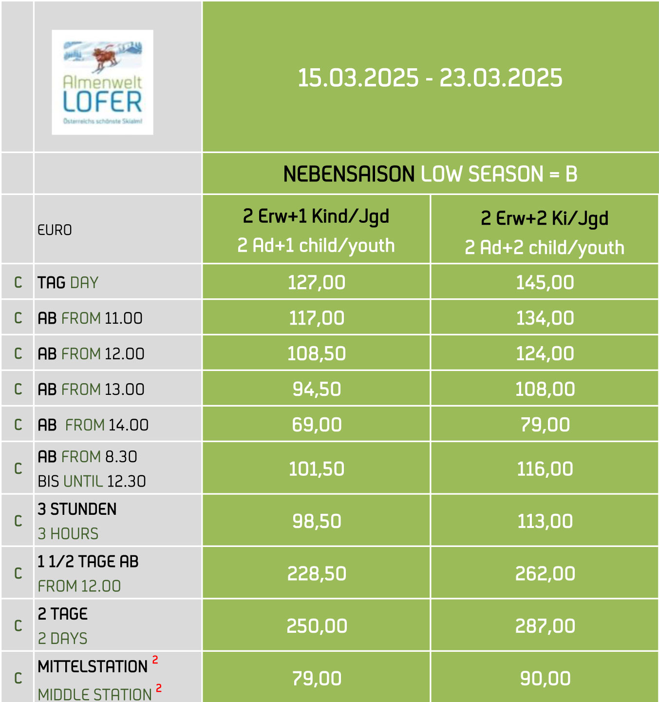2 Familienpreise: Familienskipässe erhält man ab 2 Erwachsenen + 1 od. 2 Kinder/Jugendlichen (Jg. 2019 - 2007). Das 3. und weitere eigene Kinder od. Jugendliche fahren FREI, gilt NUR mit Nachweis der Familienzusammengehörigkeit (Nachweis gemeinsamer Wohnsitz erforderlich. Ein aktueller Meldezettel und ein Ausweis mit Bild sind vorzulegen.)