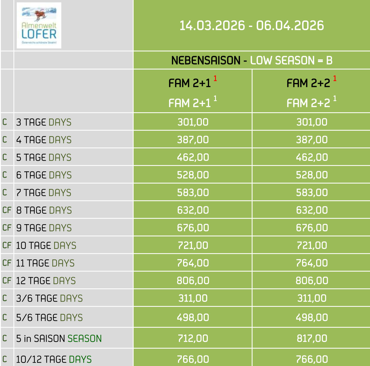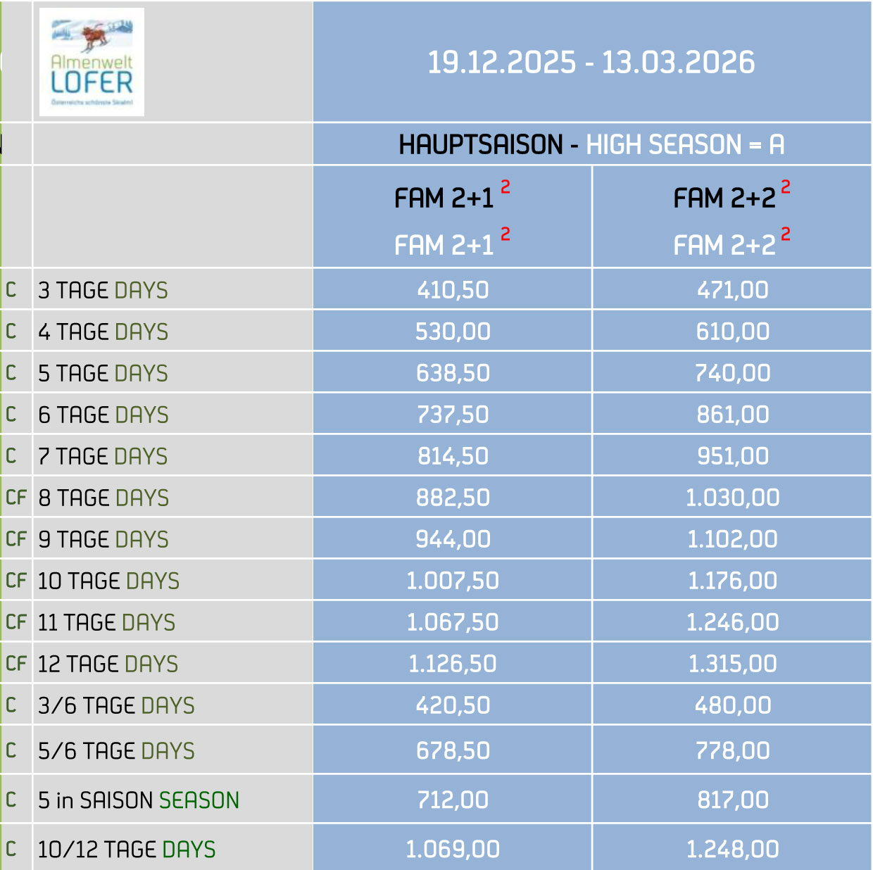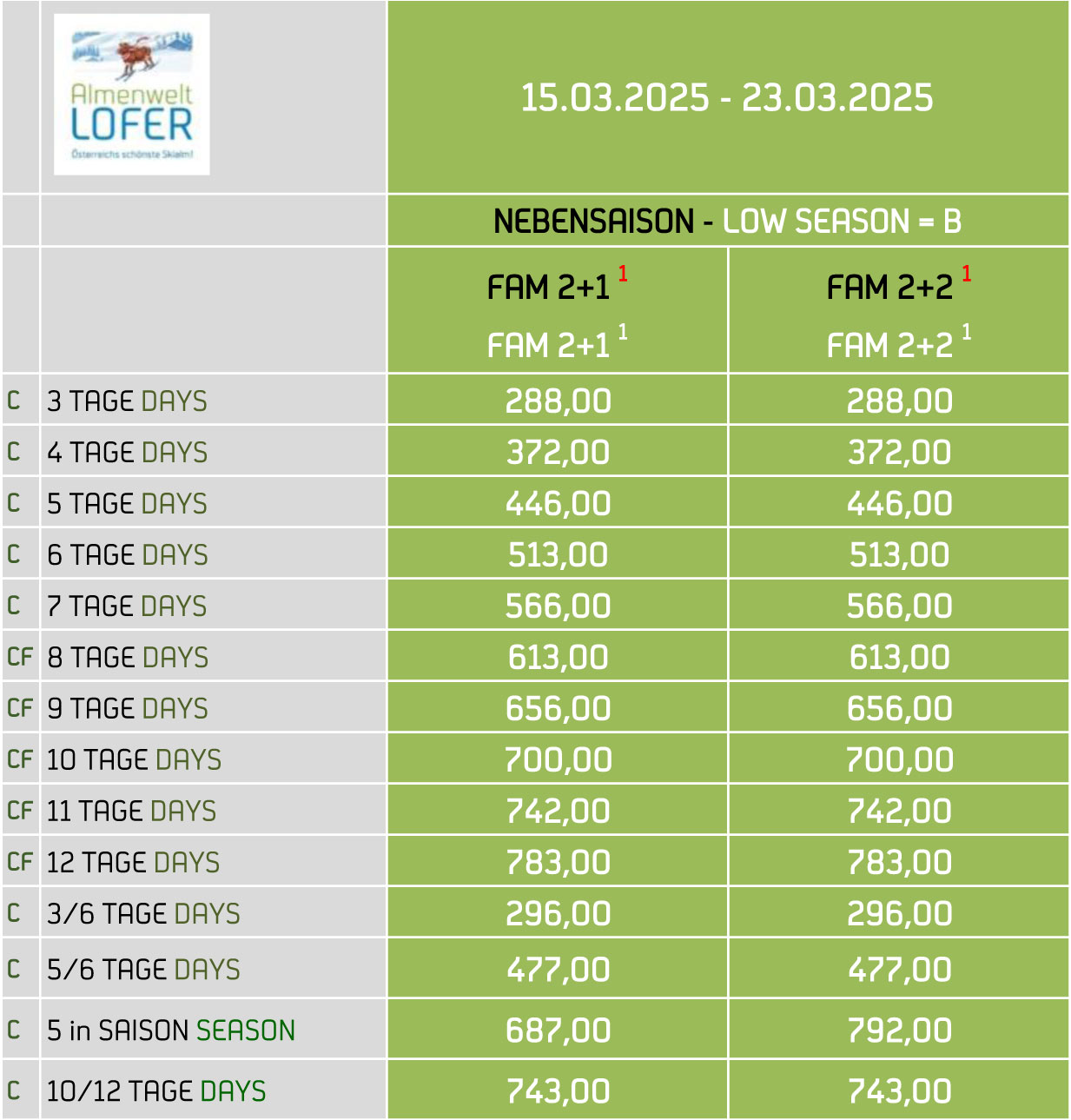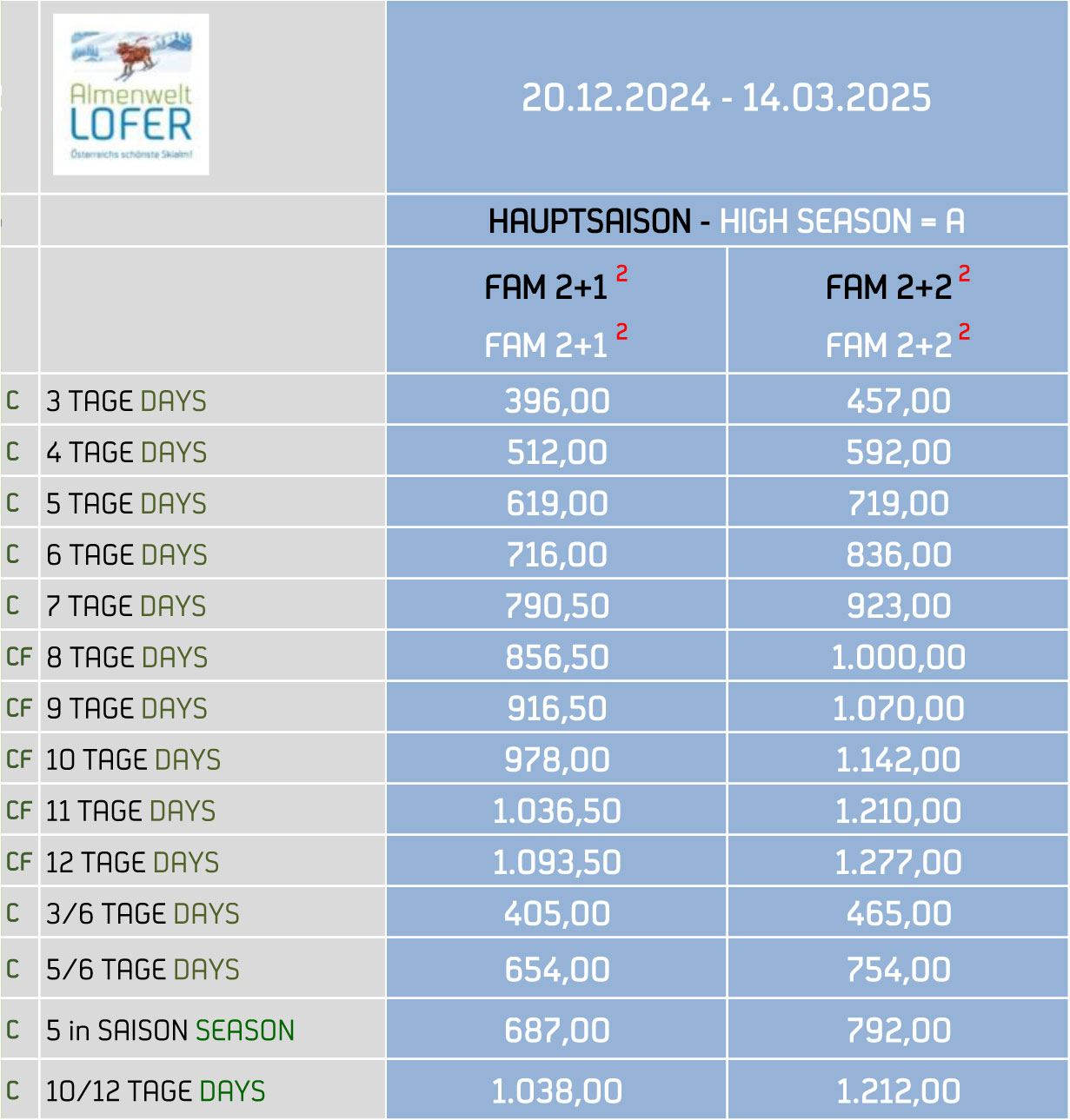 2 Familienpreise: Familienskipässe erhält man ab 2 Erwachsenen + 1 od. 2 Kinder/Jugendlichen (Jg. 2019 - 2007). Das 3. und weitere eigene Kinder od. Jugendliche fahren FREI, gilt NUR mit Nachweis der Familienzusammengehörigkeit (Nachweis gemeinsamer Wohnsitz erforderlich. Ein aktueller Meldezettel und ein Ausweis mit Bild sind vorzulegen.)