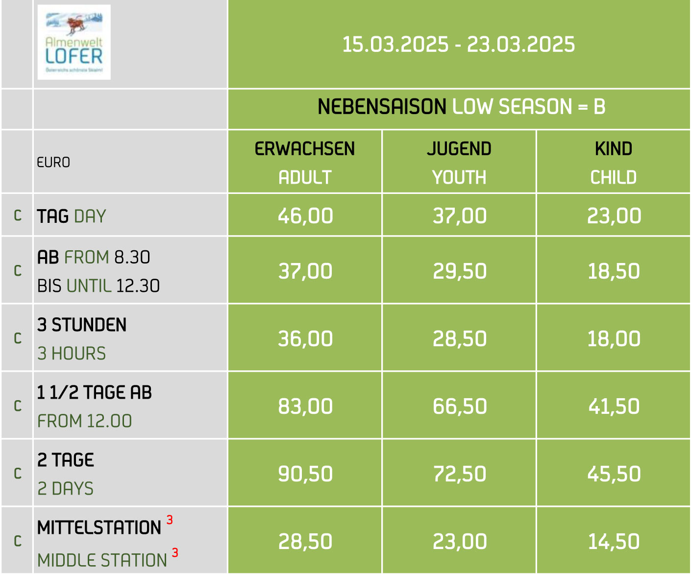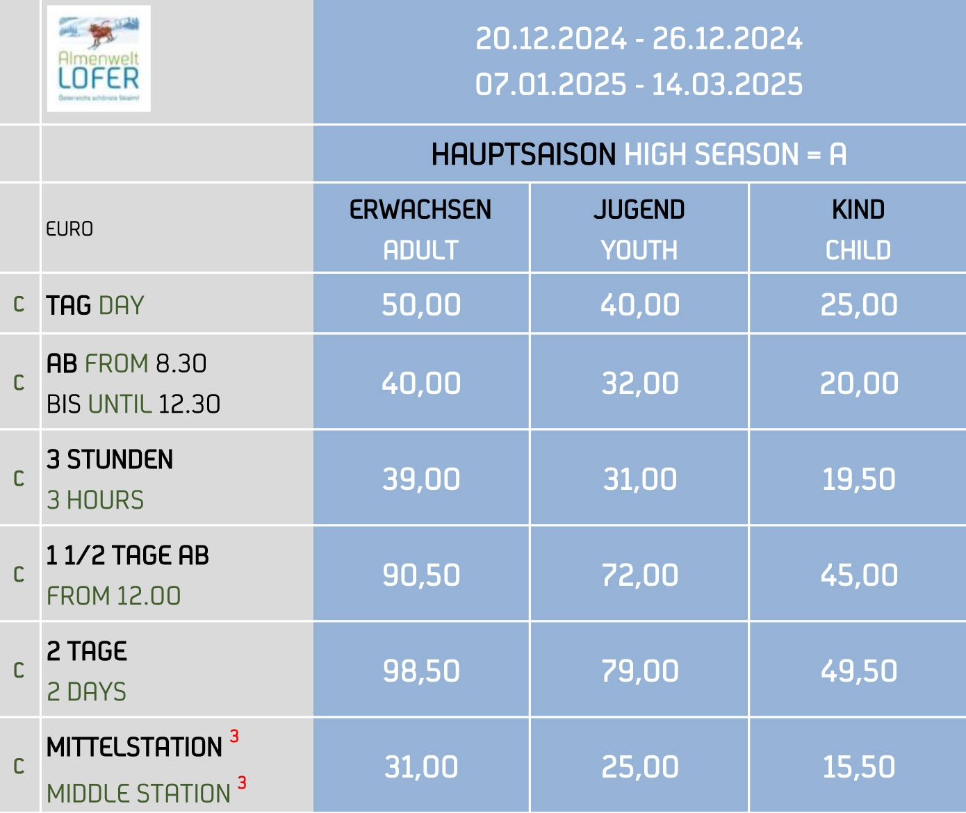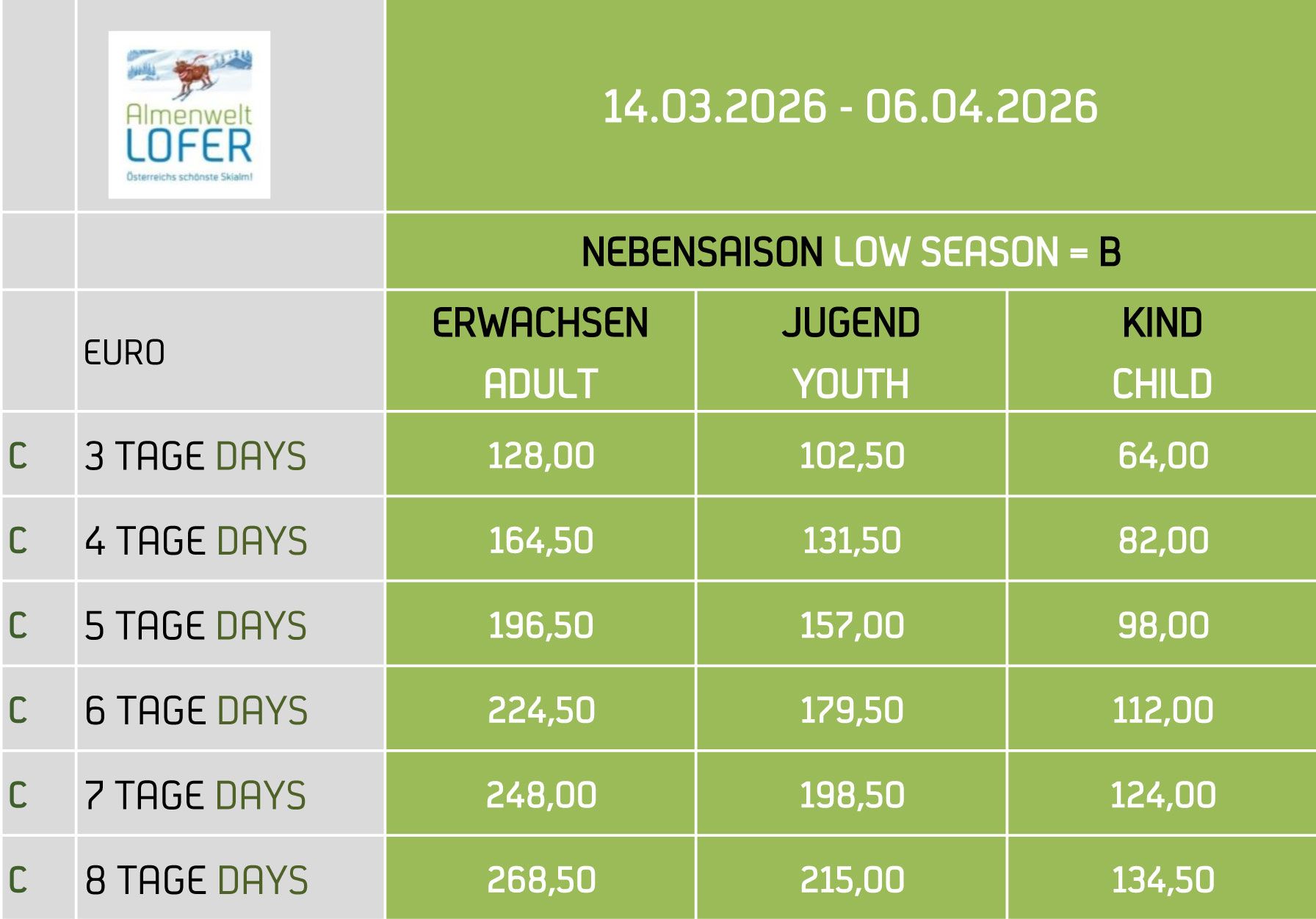 Jugendpreise: Gelten für die Jahrgänge 2009 bis 2007 (Ausweis erforderlich).
