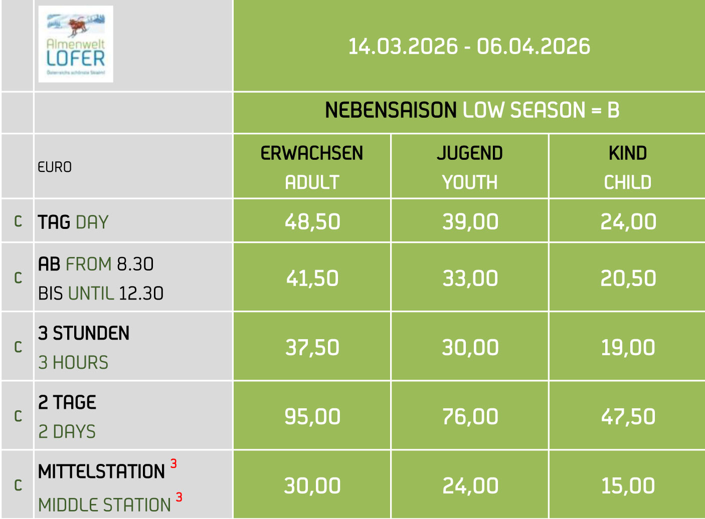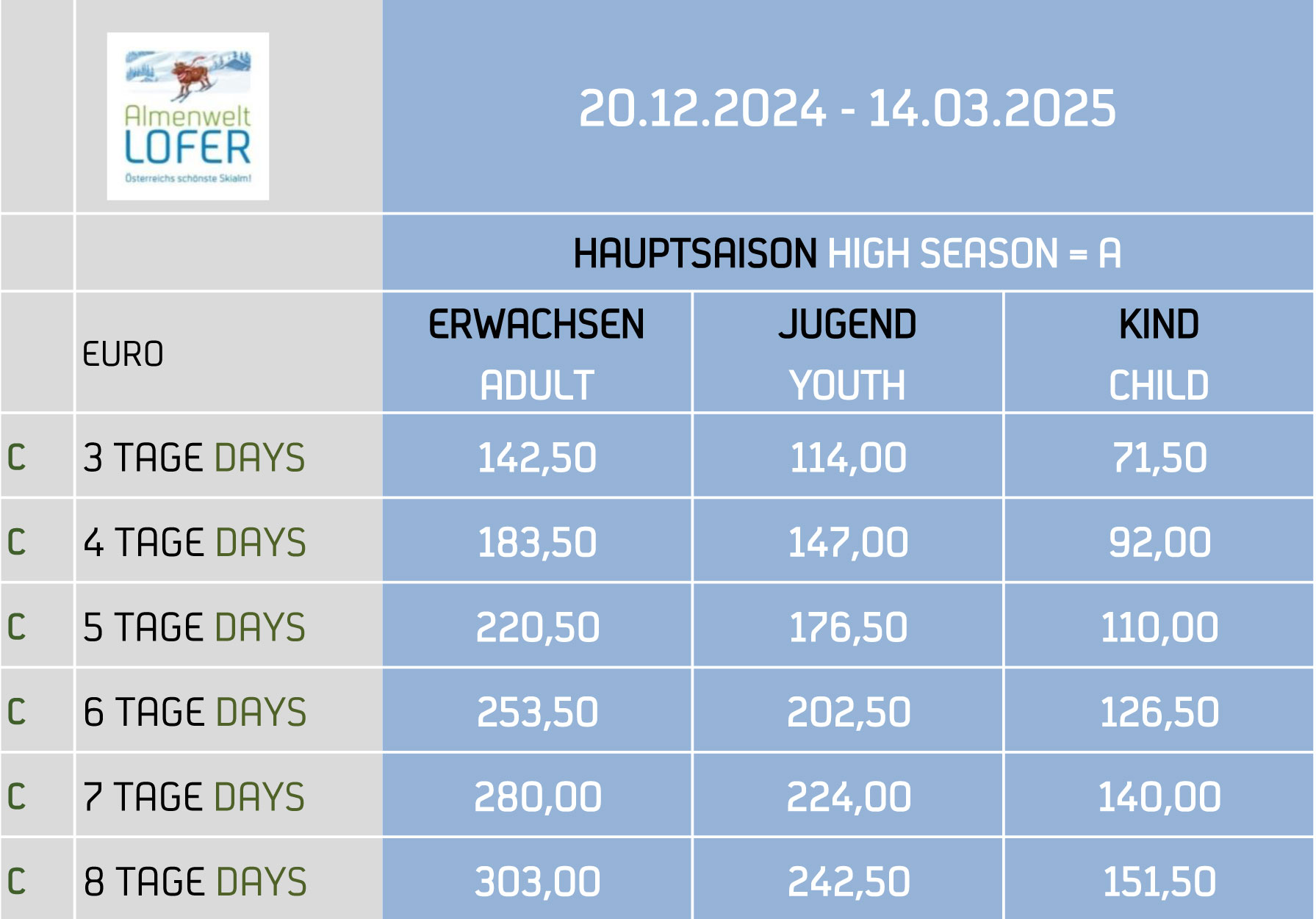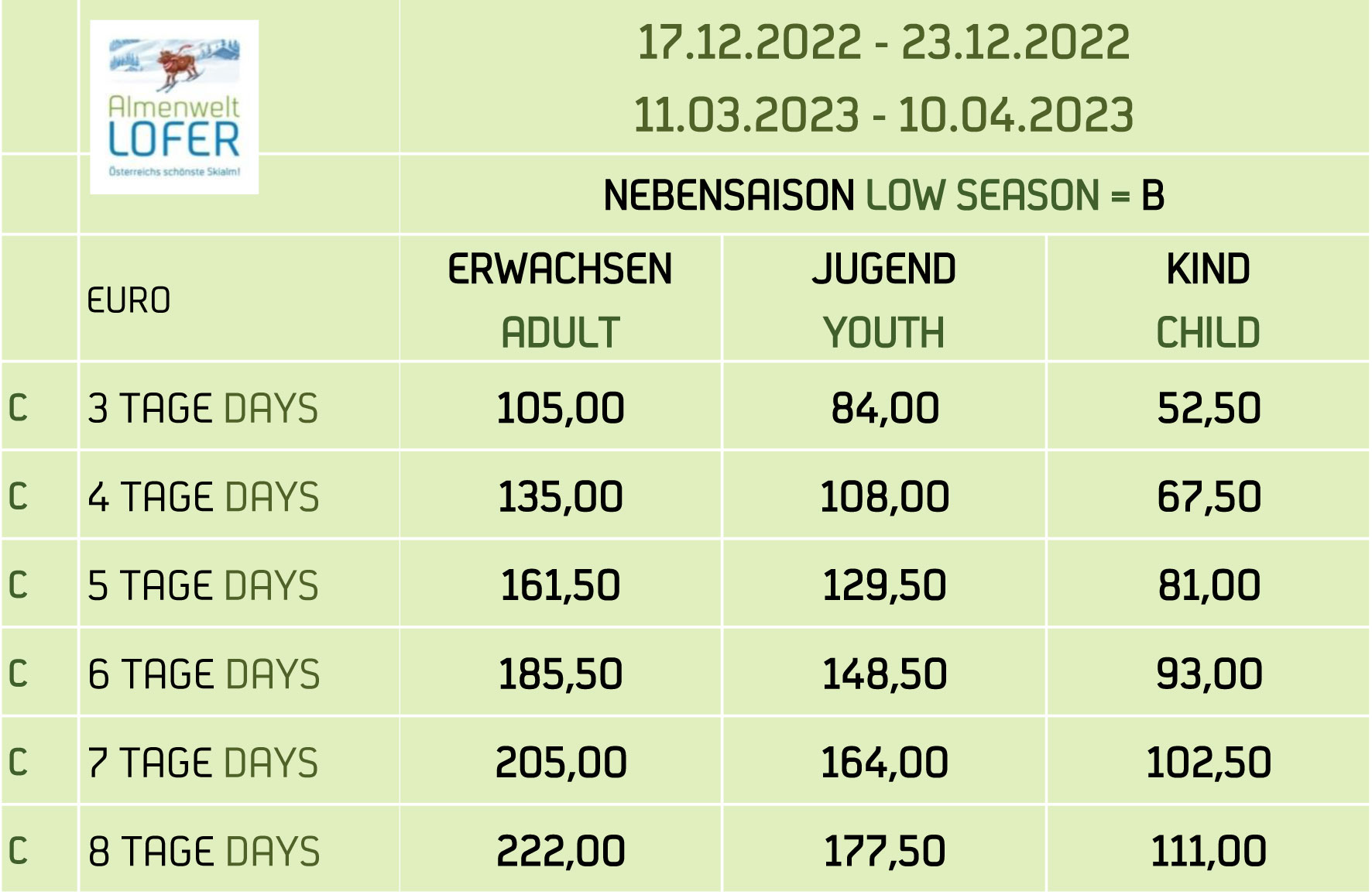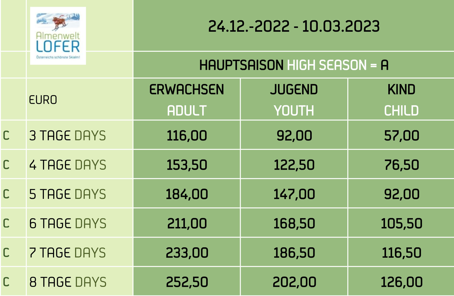 Jugendpreise: Gelten für die Jahrgänge 2009 bis 2007 (Ausweis erforderlich).