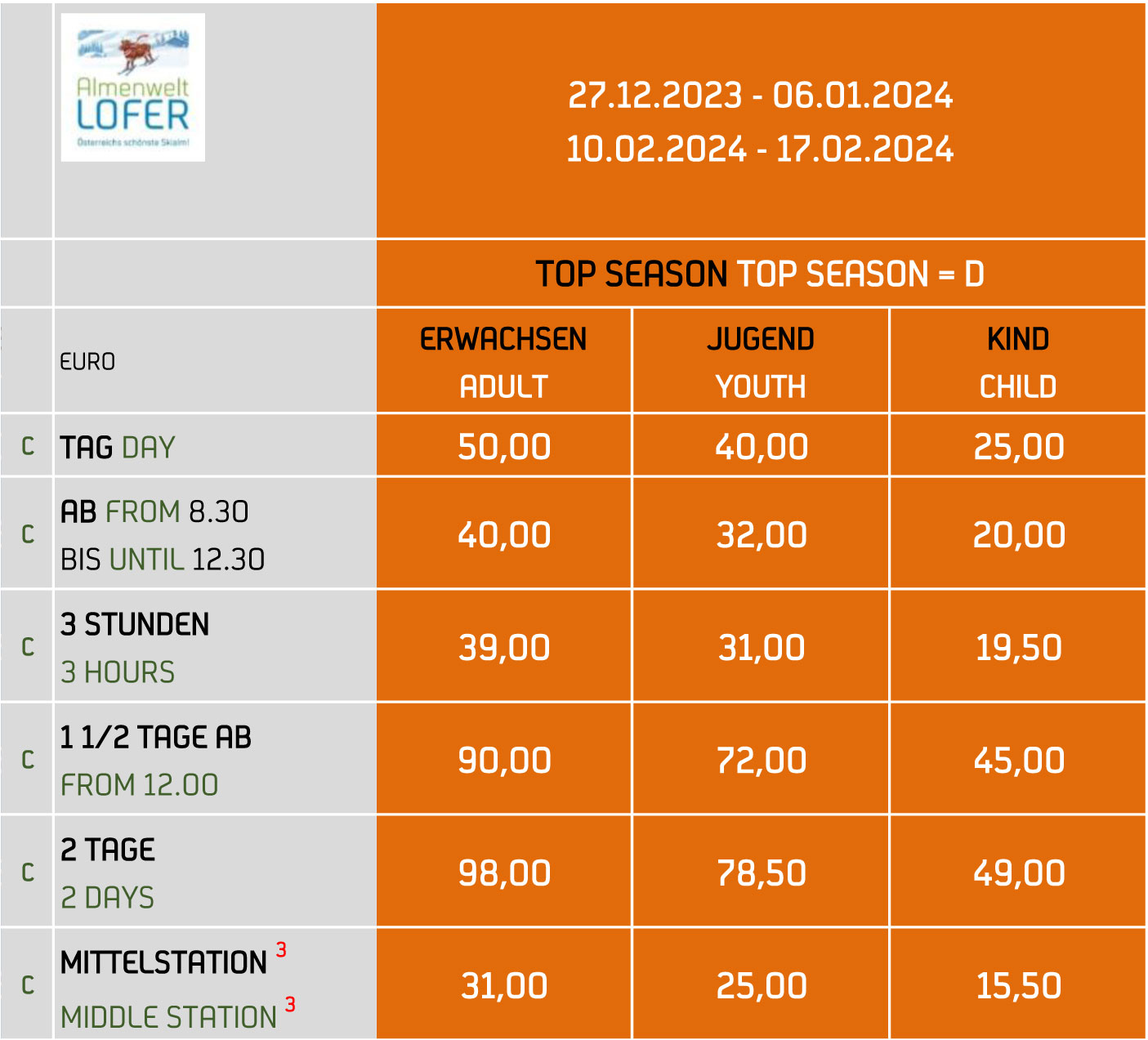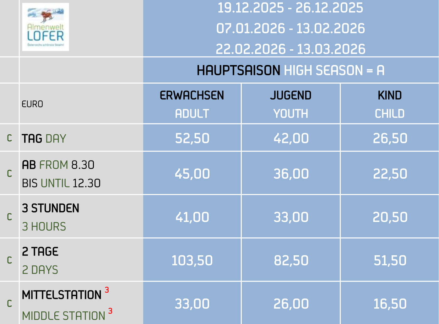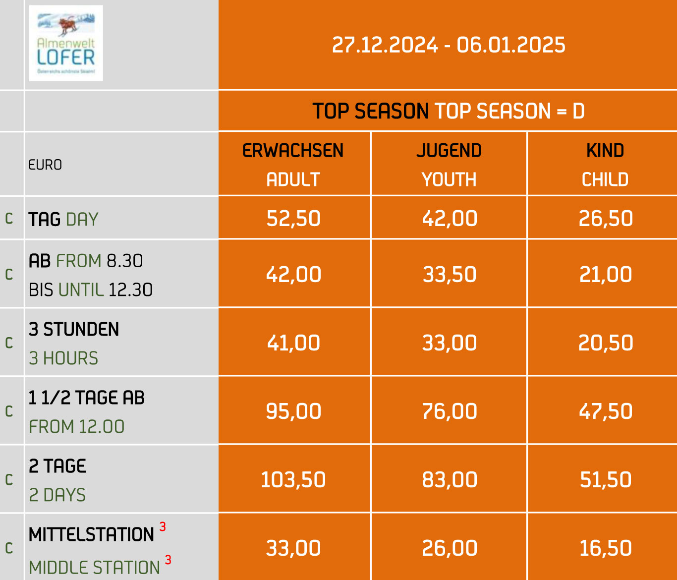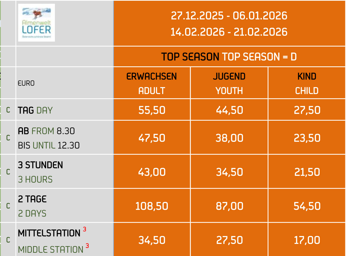 Die Karten bitte vorbestellen (auch am Tag der Anreise ab 07:30 Uhr unter +43 6588 8450 möglich).