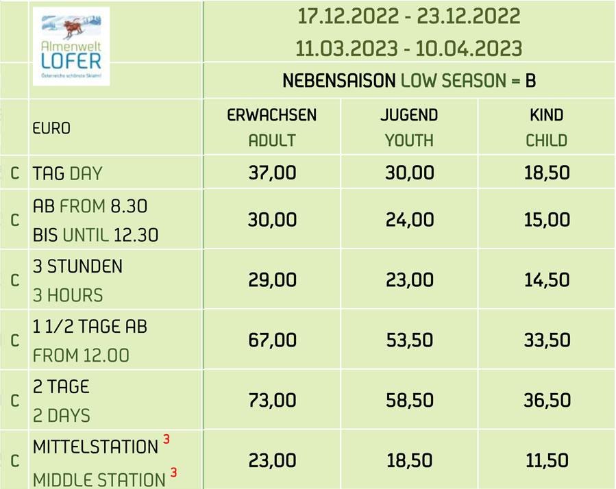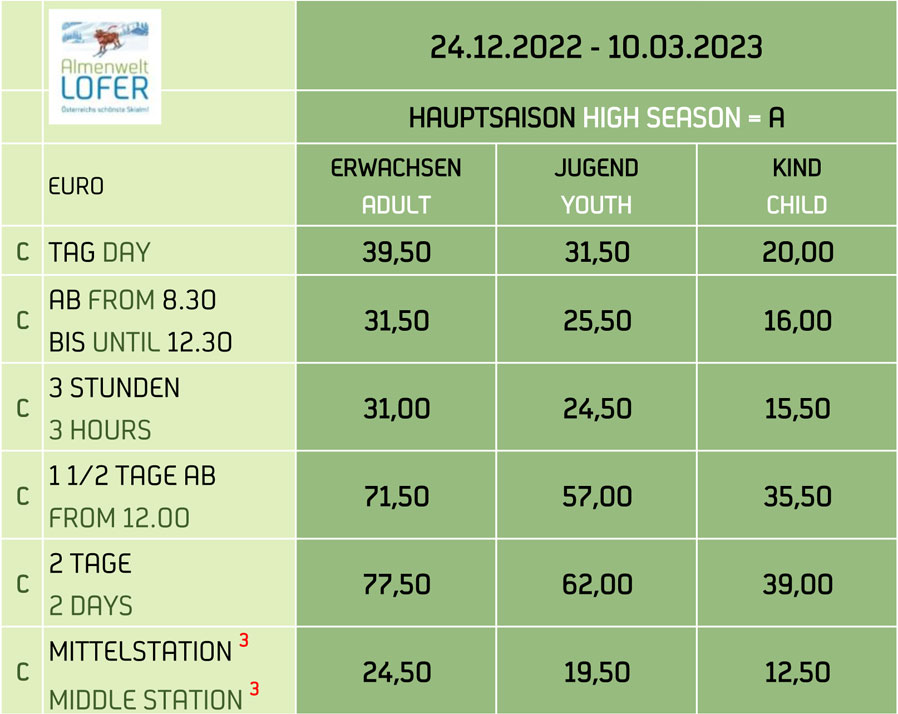 Der Almenwelt Zauberteppich auf der Loferer Alm (Berg- und Talfahrt sind zu bezahlen) und der Kinderlift bei der Talstation Almbahn I sind kostenlos zu benützen.