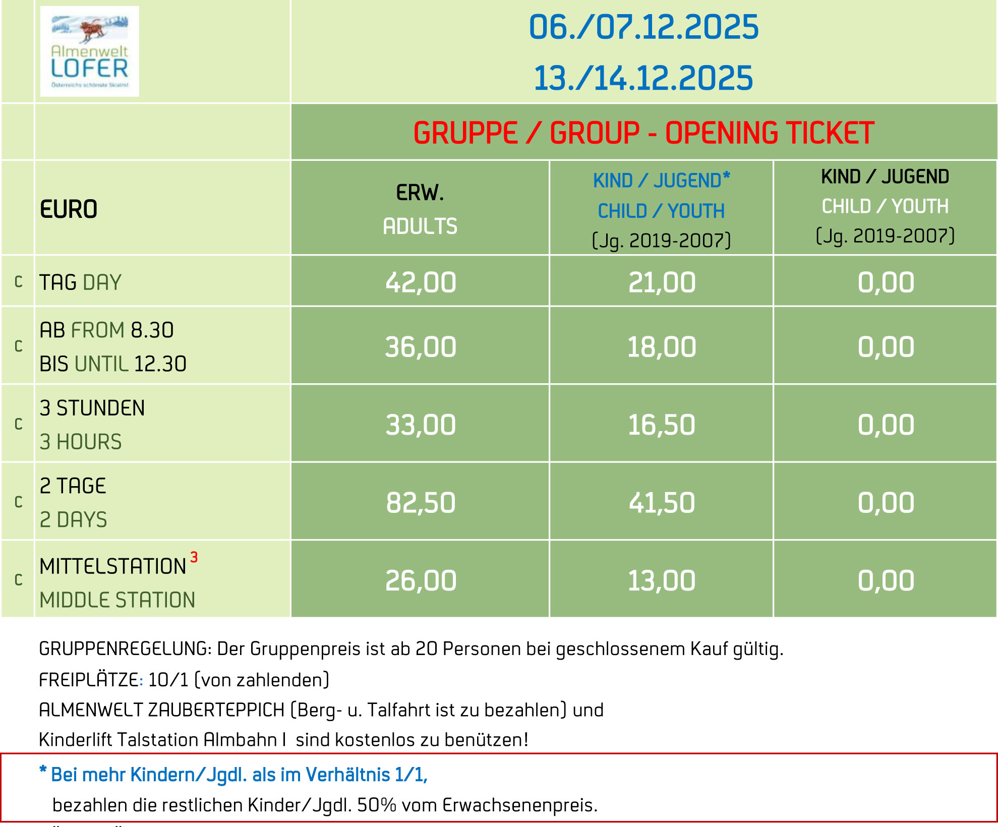 Gruppenpreise sind ab 20 Personen erhältlich. Freiplätze 10/1 bei geschlossenem Kauf.