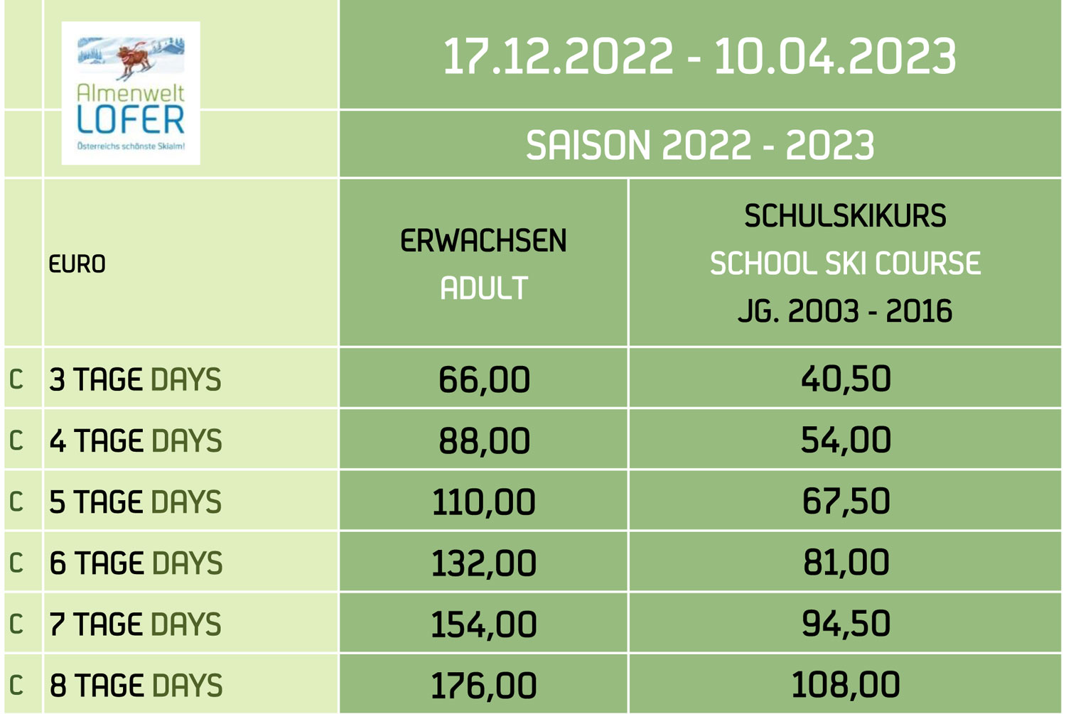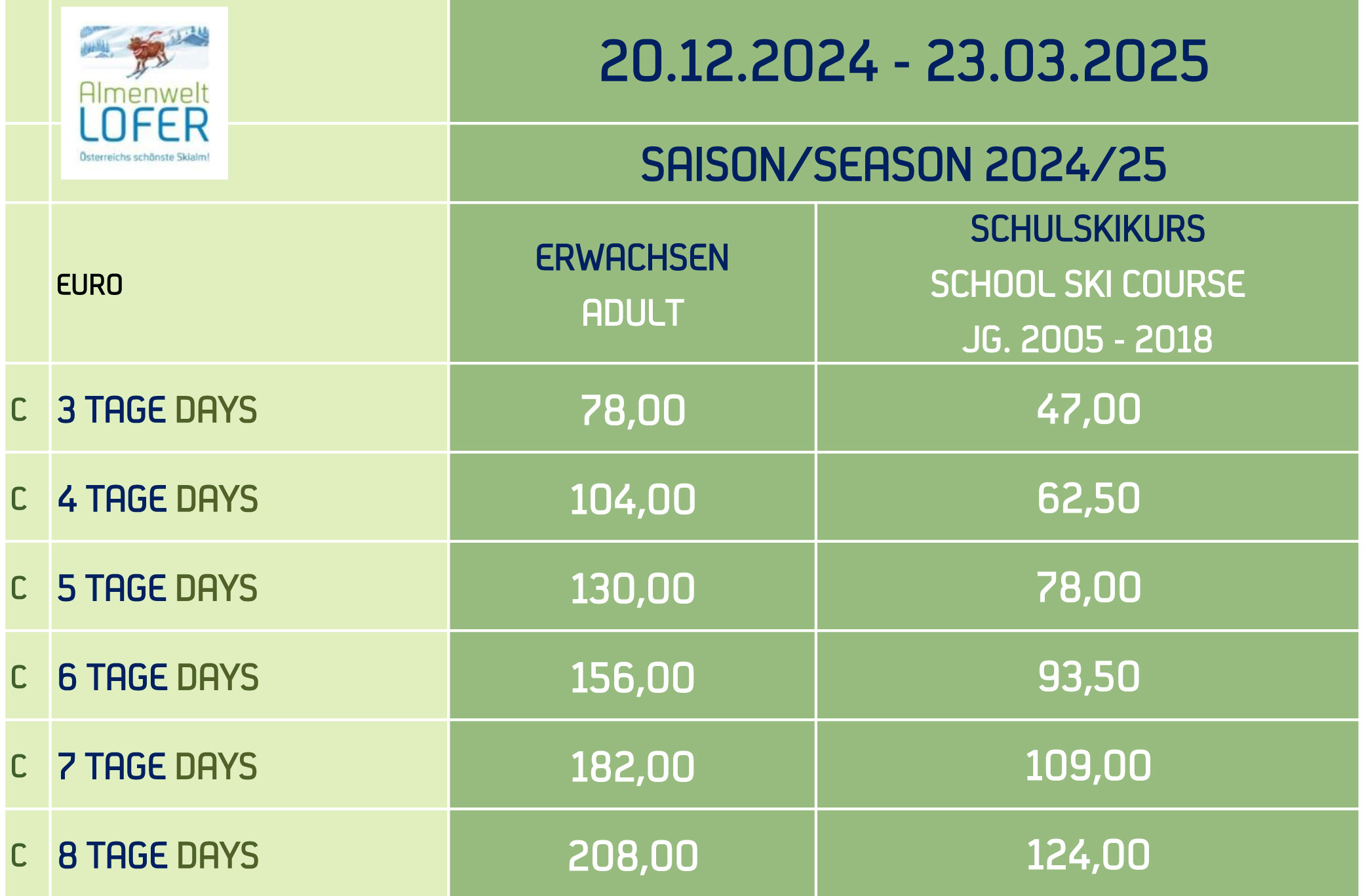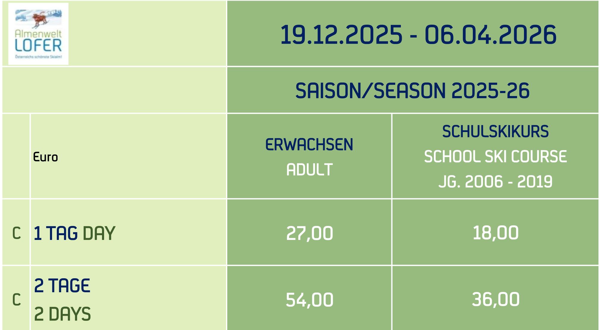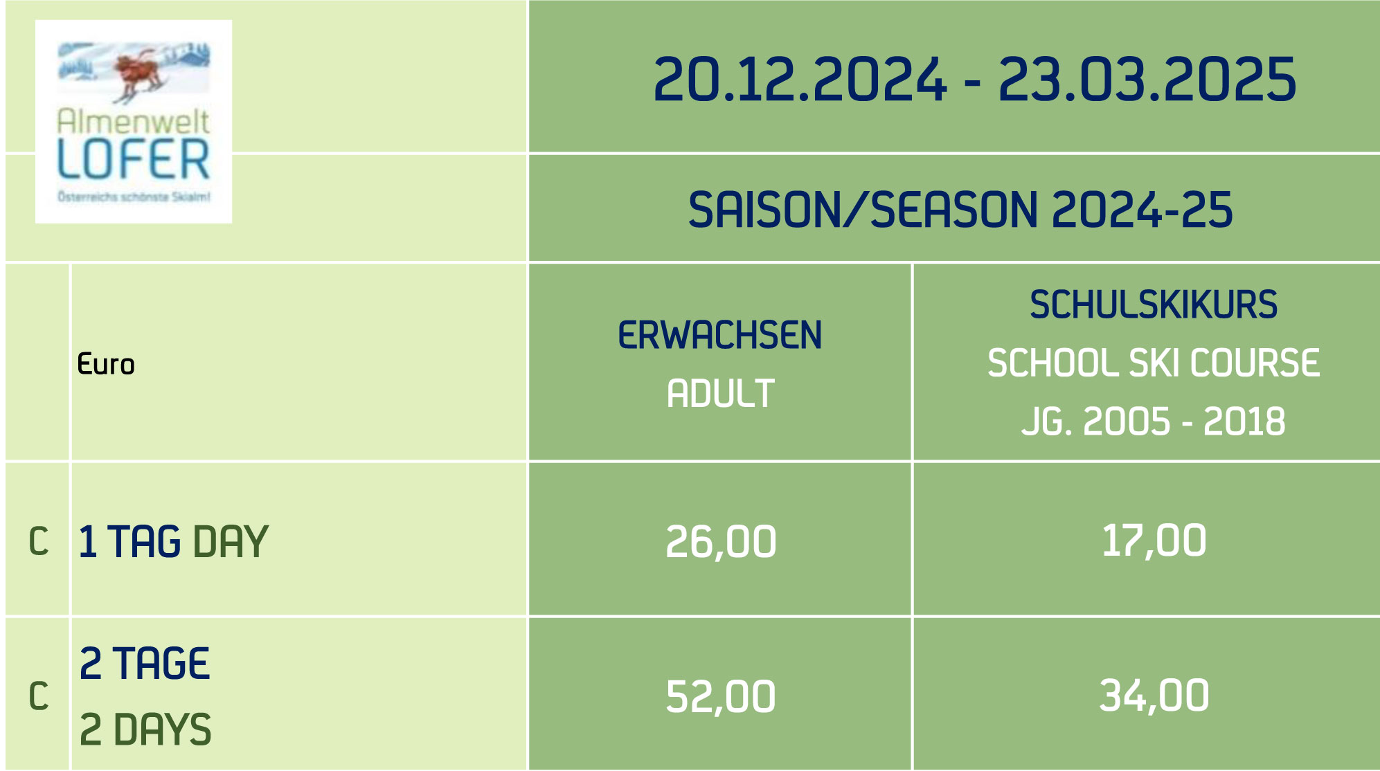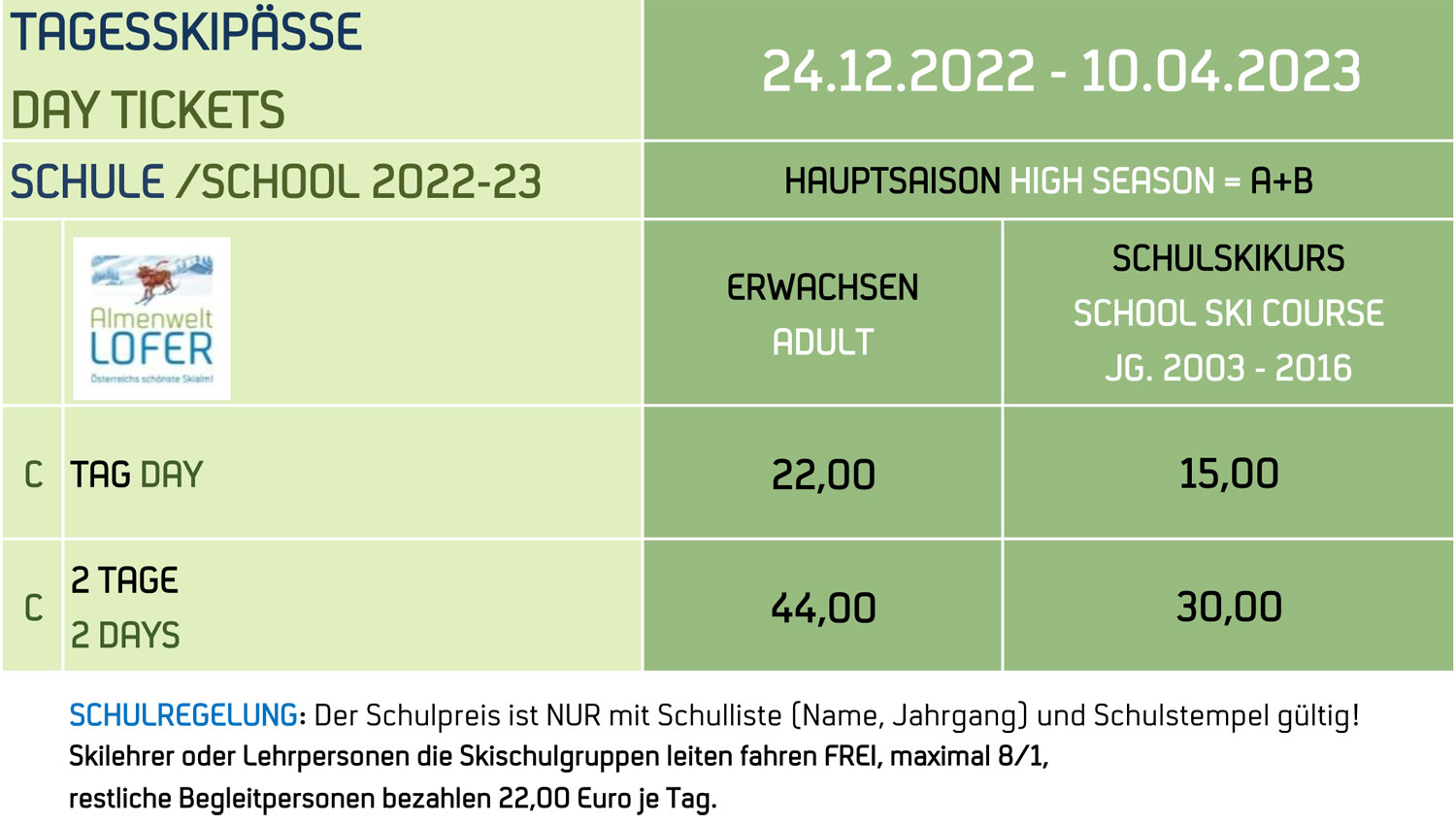 SCHULREGELUNG: Der Schulpreis ist NUR mit einer Schulliste (muss Name und Jahrgang der Schüler enthalten) und Schulstempel gültig! Skilehrer oder Lehrpersonen die Skischulgruppen leiten fahren FREI, maximal 8/1. Restliche Begleitpersonen zahlen 27,00 EUR je Tag!