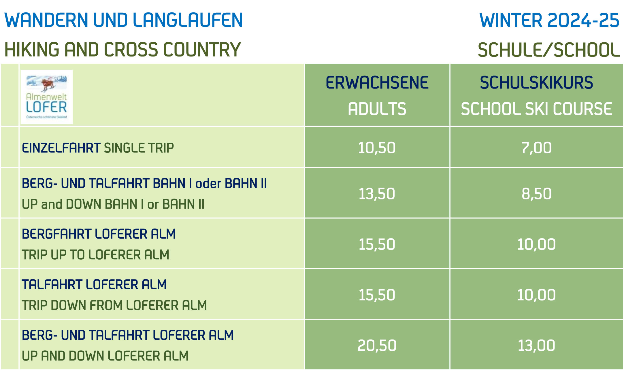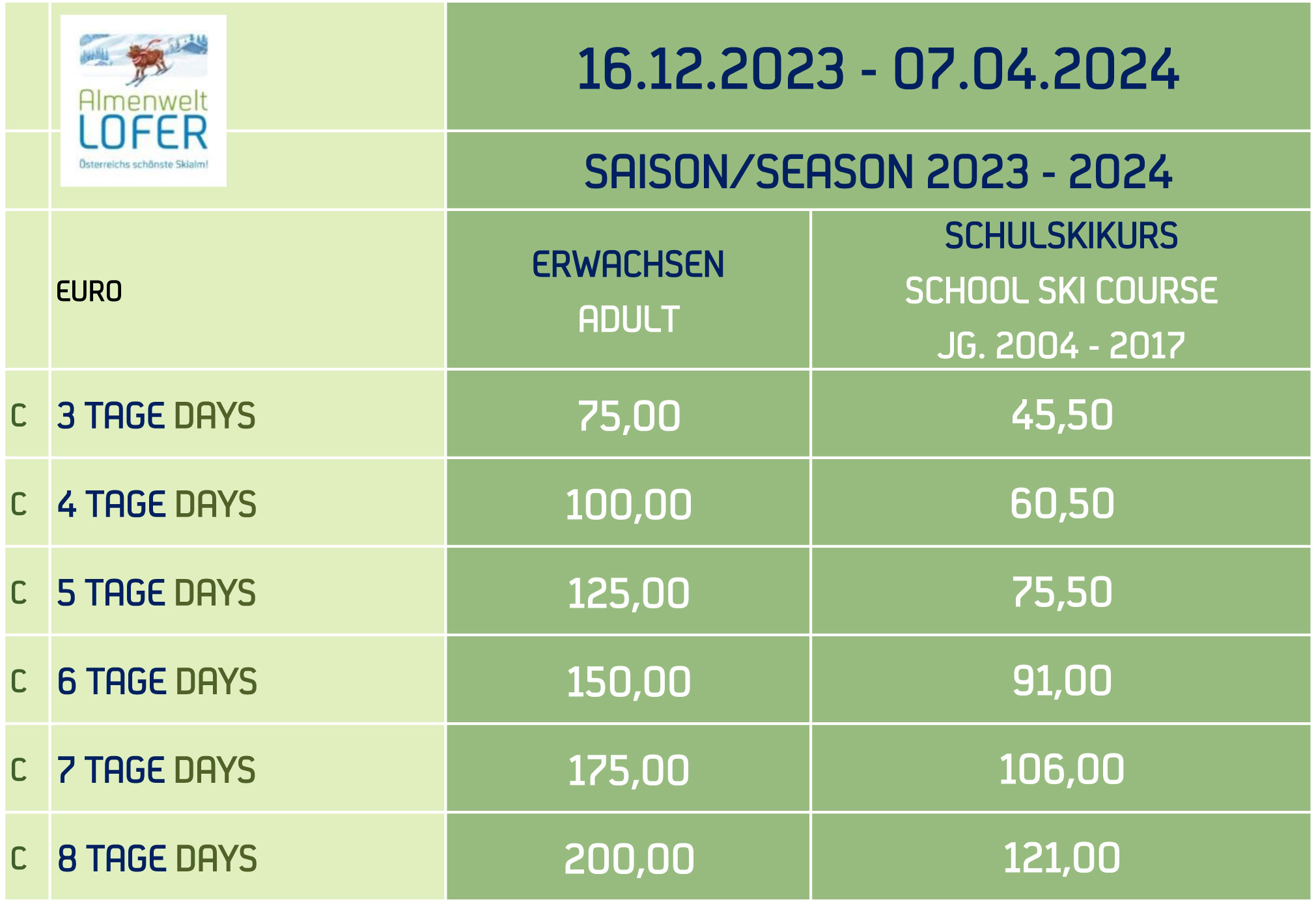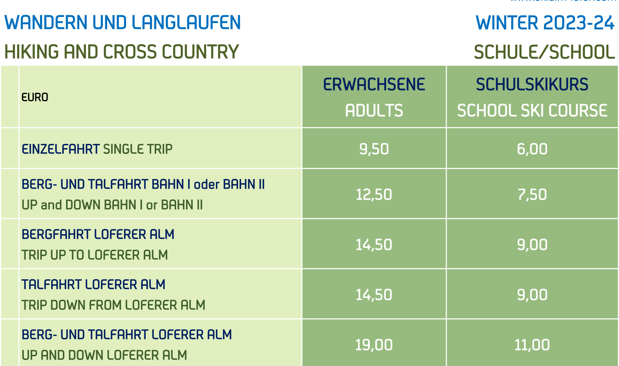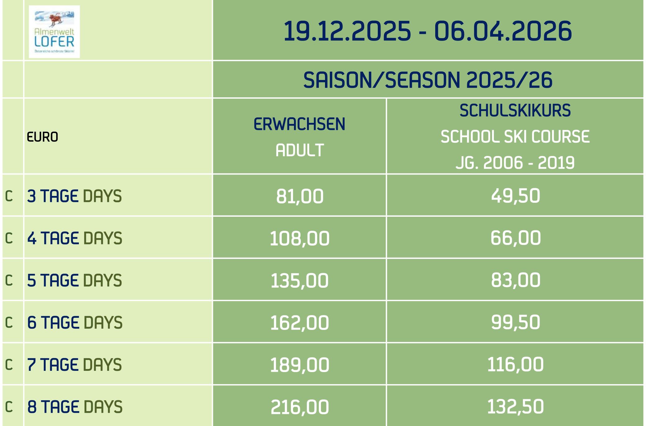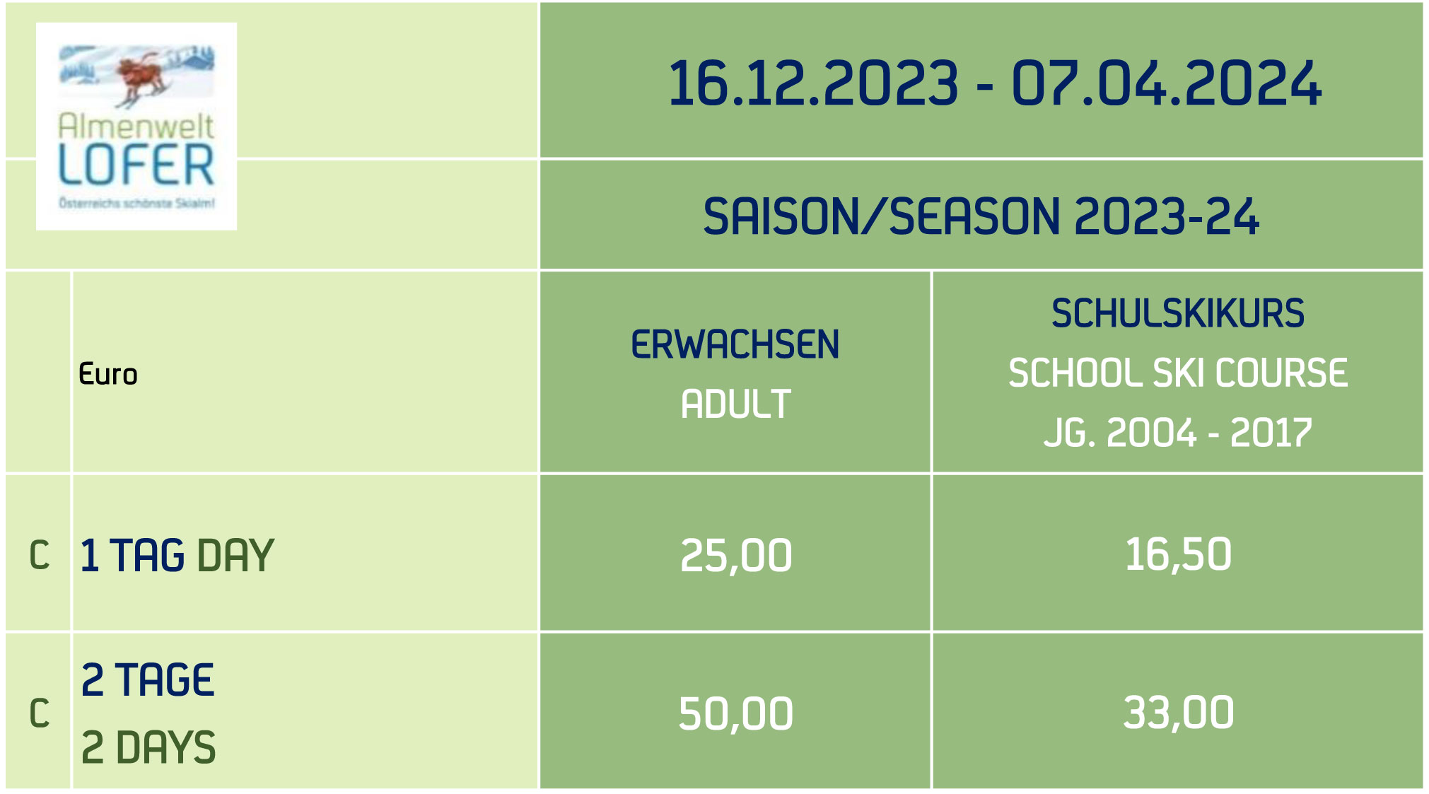 SCHULREGELUNG: Der Schulpreis ist NUR mit einer Schulliste (muss Name und Jahrgang der Schüler enthalten) und Schulstempel gültig! Skilehrer oder Lehrpersonen die Skischulgruppen leiten fahren FREI, maximal 8/1. Restliche Begleitpersonen zahlen 27,00 EUR je Tag!