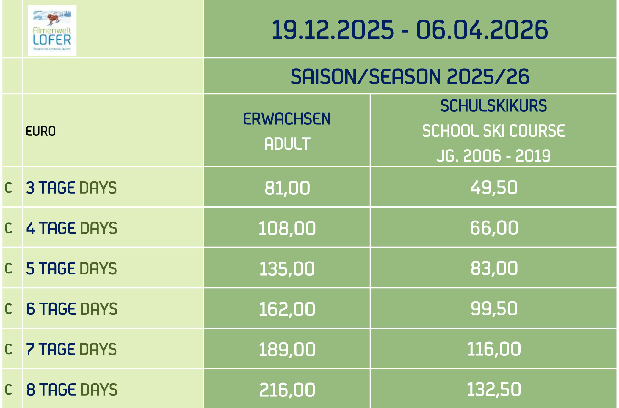 Schulskikurs: Preise gültig für Kinder und Jugendliche, Jahrgänge 2019 - 2006! Bis 19 Jahre NUR bei Schulen!