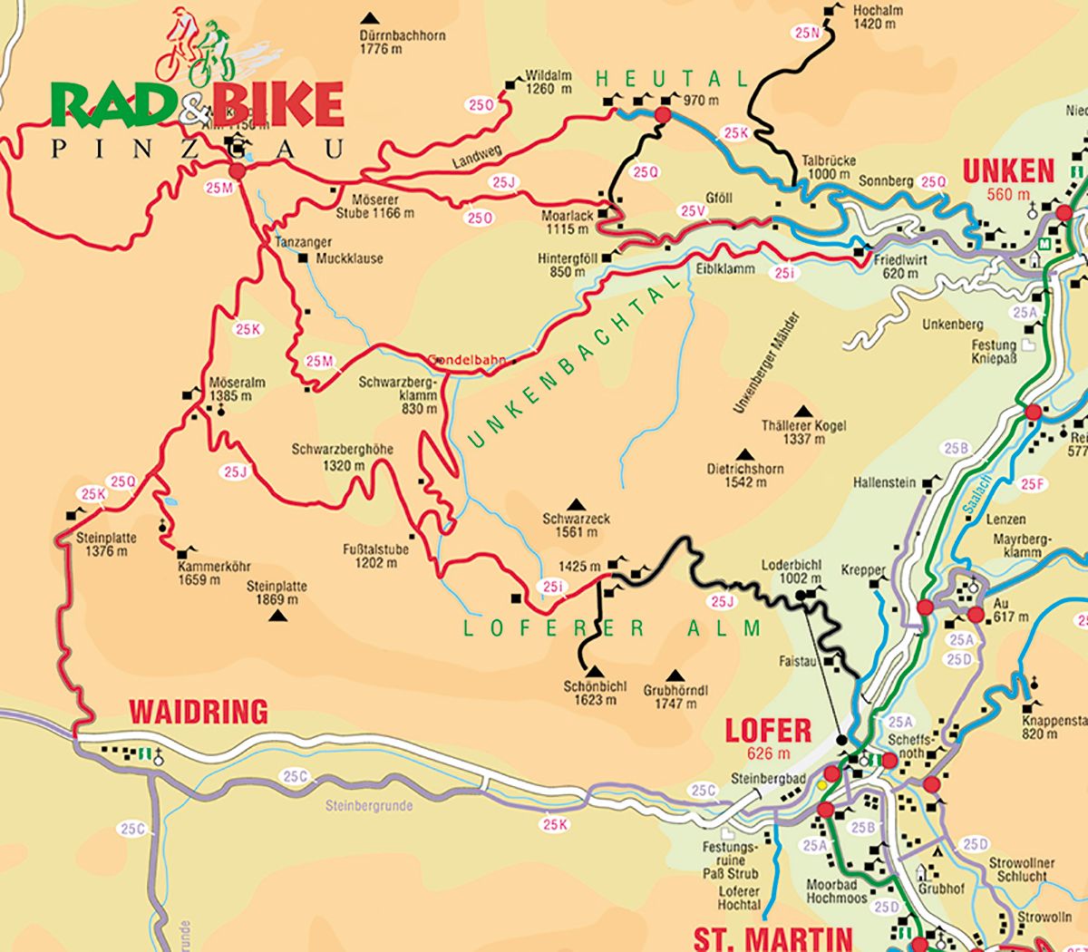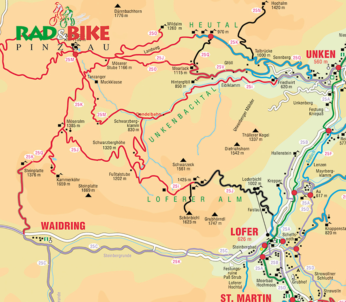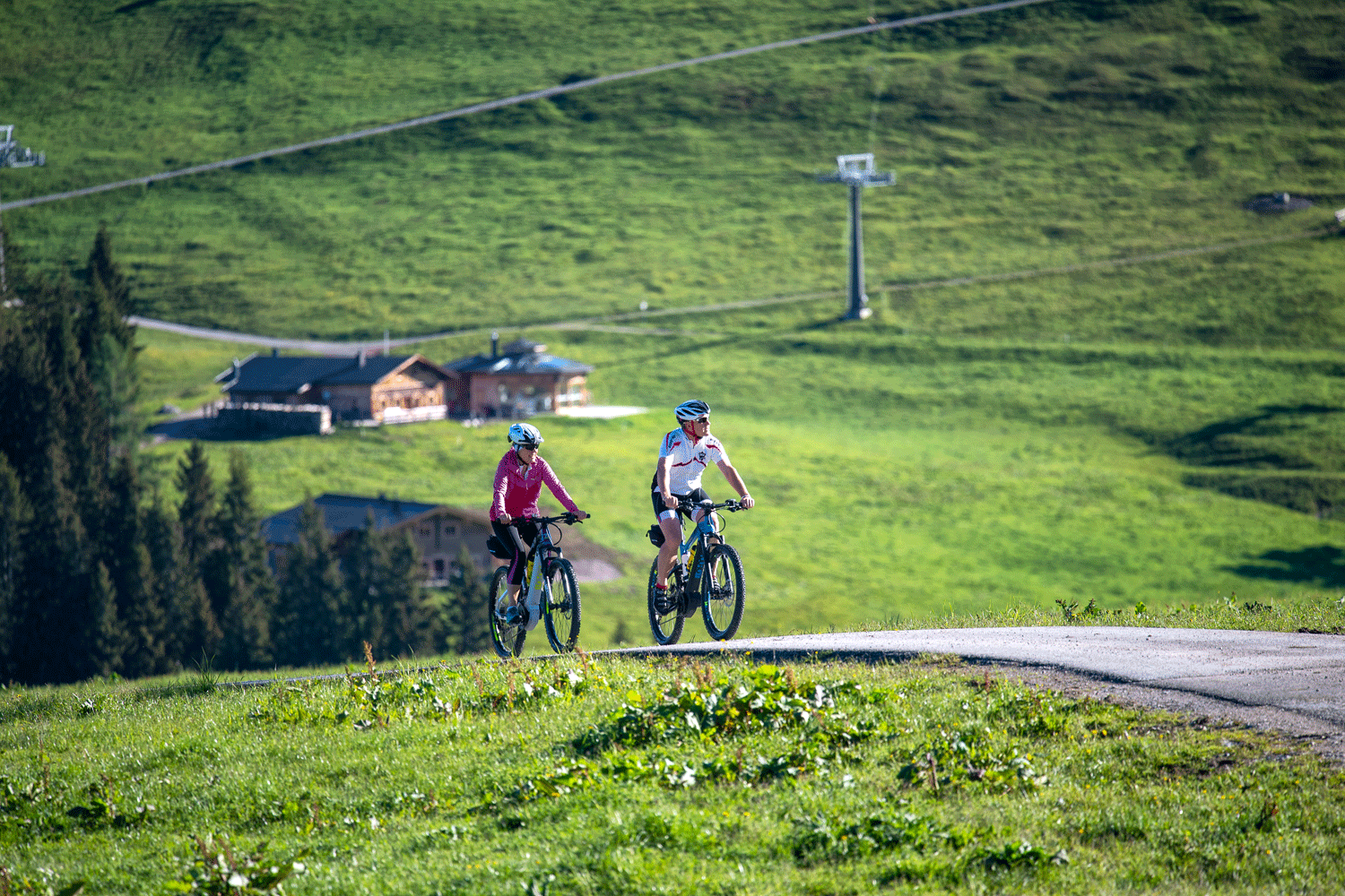 Bequem erreichen Sie mit Ihrem Bike (Transport pro Bike 5 EUR, Achtung: E-Bikes werden nur mit Almbahn I befördert!) mit der Almbahn I + Almbahn II die Almenwelt Lofer, von wo aus eine sehr beliebte Mountainbiketour über die Waidringer Steinplatte, die Winklmoosalm in Reit im Winkl bis hin zum Unkener Heutal führt.