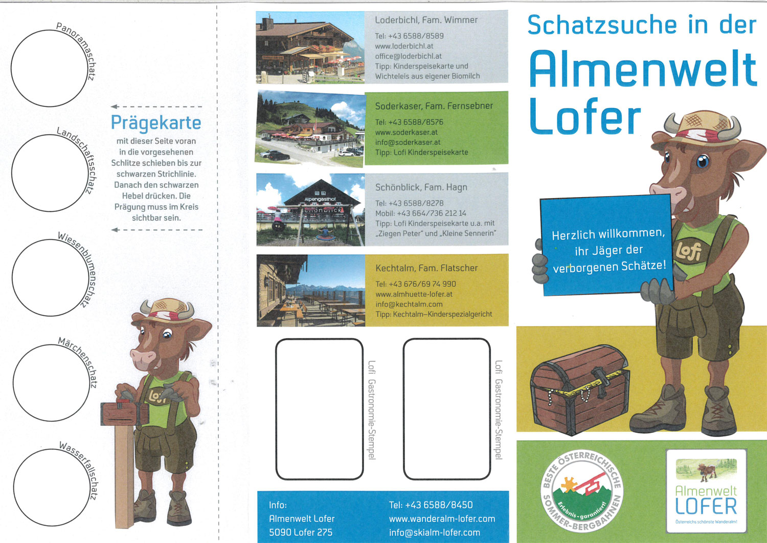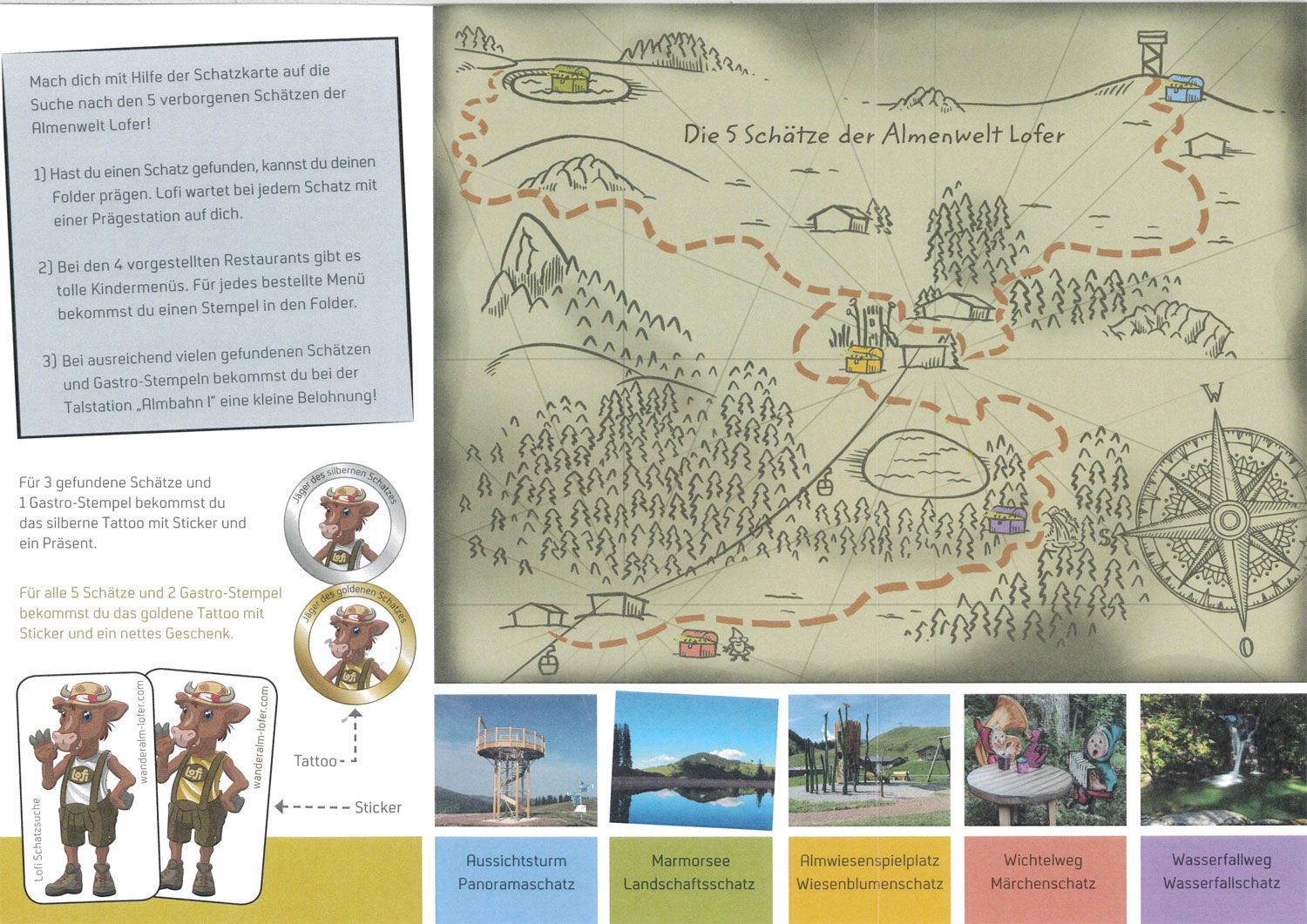 Meine Almenwelt Lofer hat viele tolle Schätze für dich parat. Die Schatzkarte (erhältlich bei der Almbahn I, Talstation) enthält eine Anleitung zur Schatzsuche, Prägepunkte von den Schätzen und Stempelstellen der Restaurants.