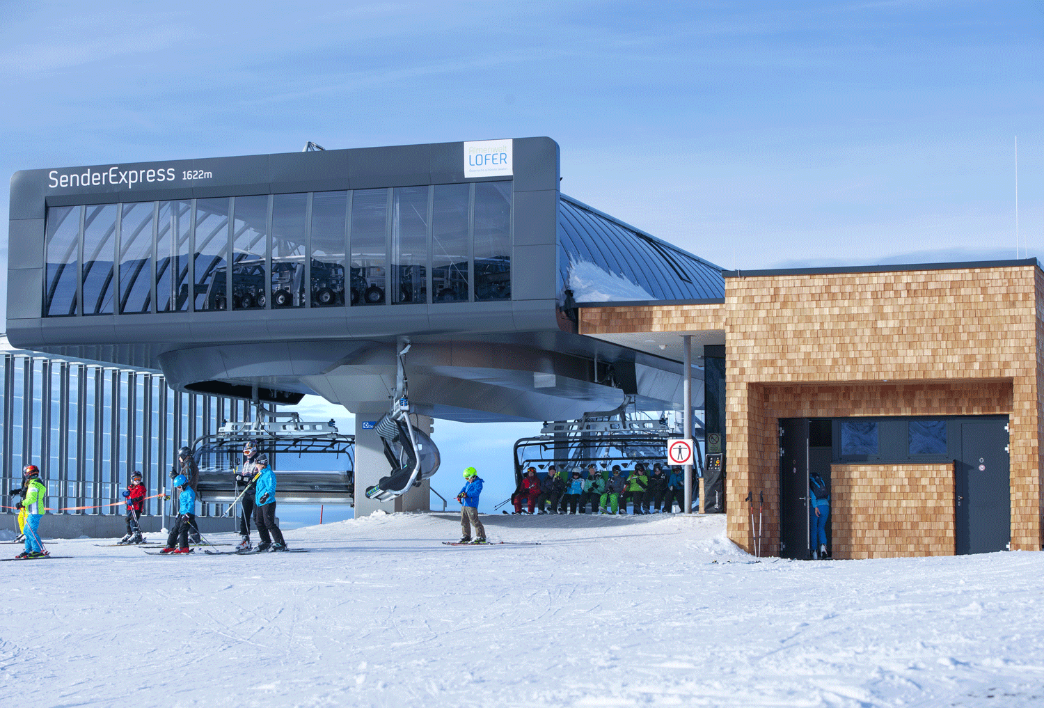 With this state-of-the-art Doppelmayr lift, a top-modern D-Line, Almenwelt Lofer is worldwide the first ski lift company with 2 childproof 8-seater chairlifts. The lift shows attractive and futuristic designs and offers highest capacity with 3400 people/hour in the overall completion. Access will be much easier and comfortable, even for small children, with the leviable conveyor belt.