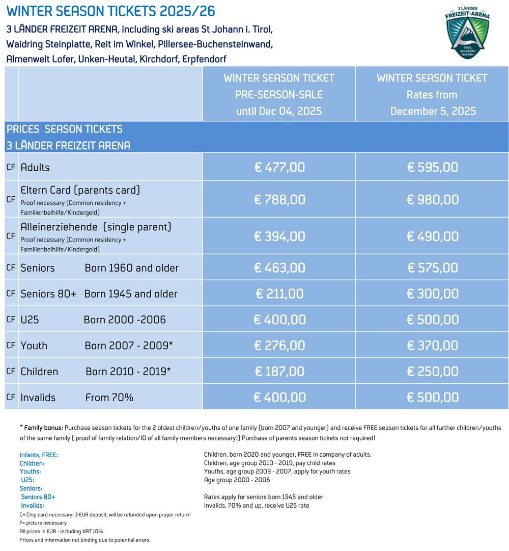 For everyone who is interested in trying out other ski areas in addition to Almenwelt Lofer, our "3 Länder Freizeit-Arena" skipass is the ideal solution: With 1 skipass, you have the choice to ski in 7 great ski areas: Almenwelt Lofer is part of the following ticket-cooperation: